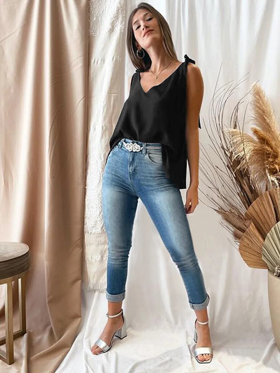 送料無料 ノースリーブのセクシーな女性ブラウス 2023 夏 V ネック包帯背中の開いたシルクシャツトップガール固体 25918 サマー 夏物 Vネック ソリッドカラー AE66565669356881403