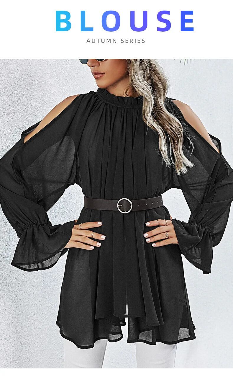 送料無料 2023 オフショルダーフレア長袖トップス中空固体シフォンシャツ春ベルトスリムウエスト白ブラウス 19120 ロング ホワイト スプリング 春物 ハーネス ソリッドカラー AE665656630695016545