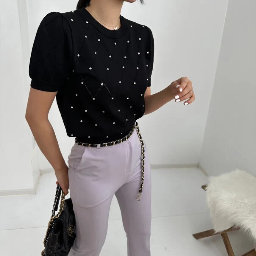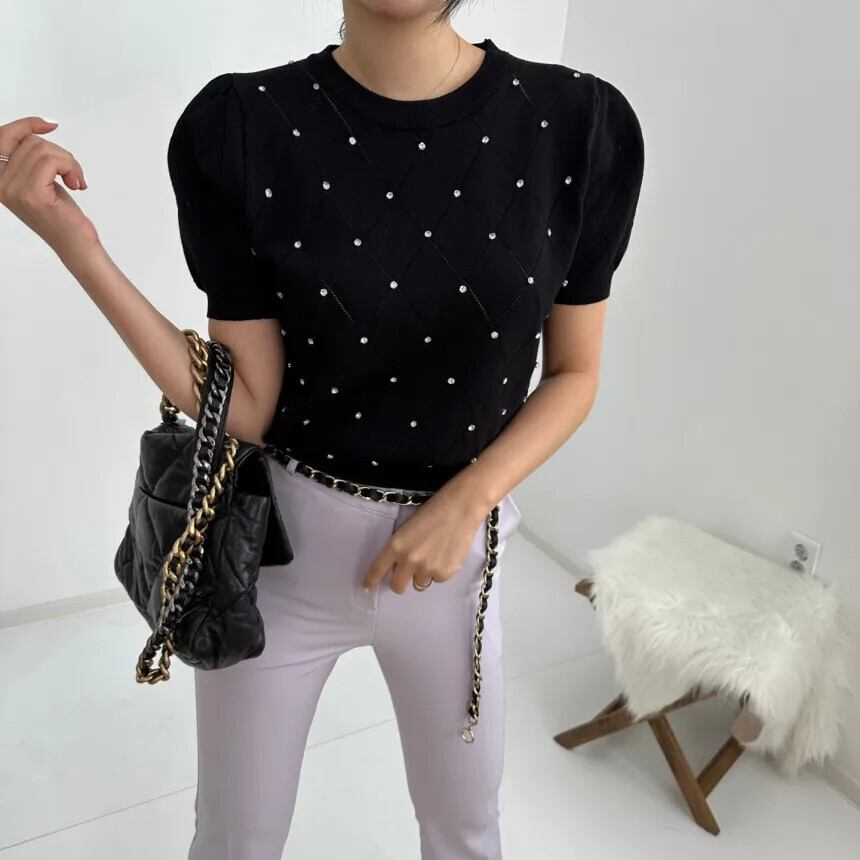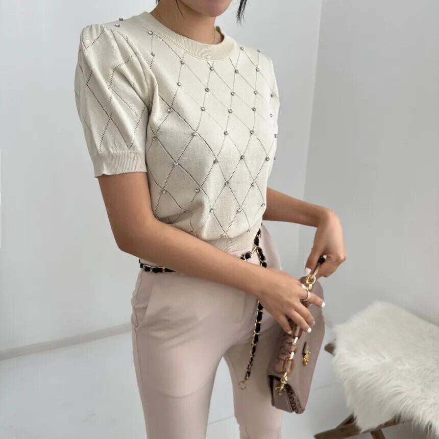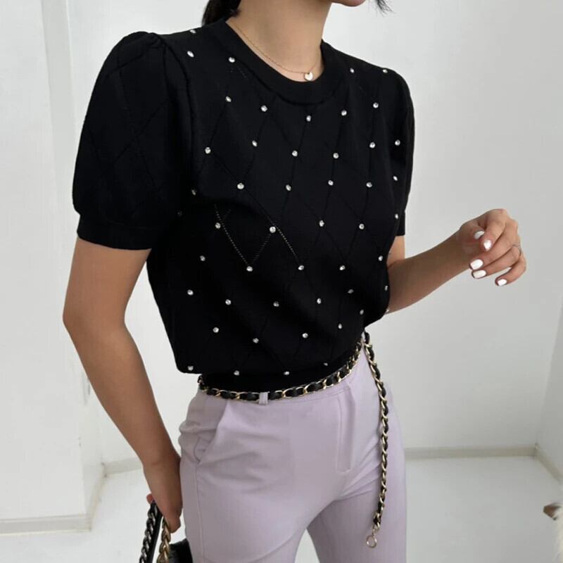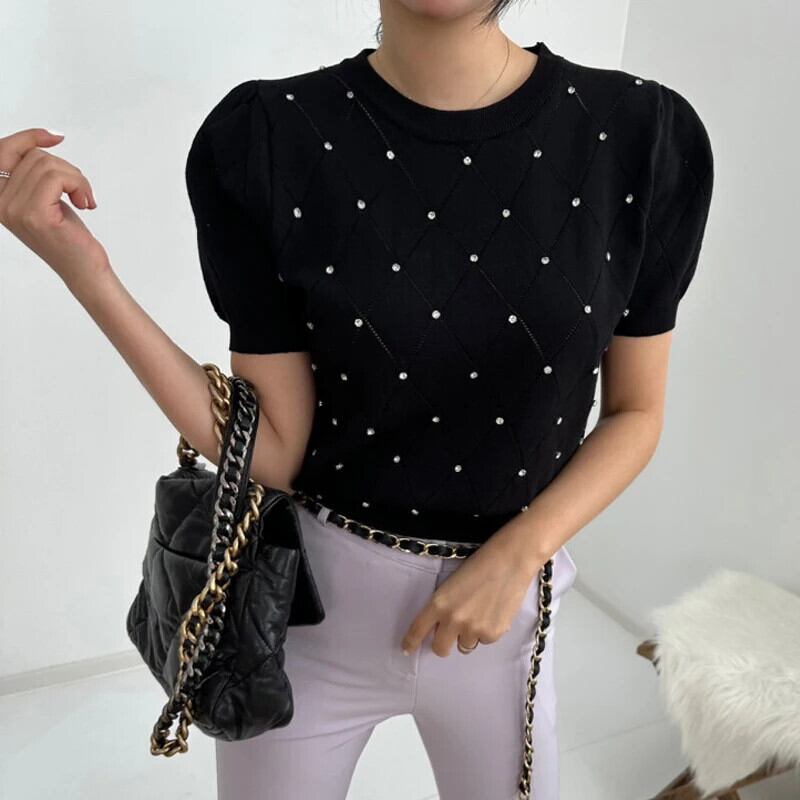 送料無料 夏中空アウトブラウススタイル薄いニットトップス女性 2023 パフ半袖 O ネック 26382 ショート ハーフスリーブ サマー 夏物 Oネック AE66565663516181705