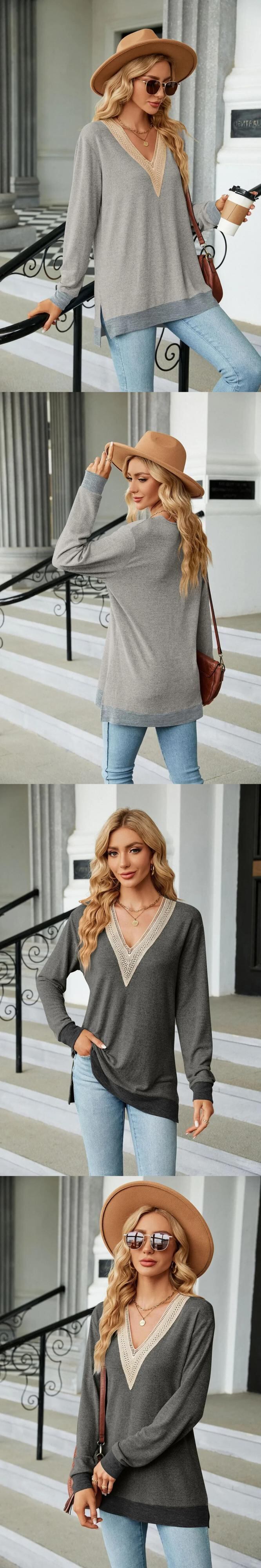 送料無料 女性の冬底固体プルオーバー Tシャツ秋中空レース V ネック Tシャツ女性ルーズ長袖 Tシャツ 29542 ロング オータム 秋物 ウィンター 冬物 Vネック ソリッドカラー AE665656648283561996