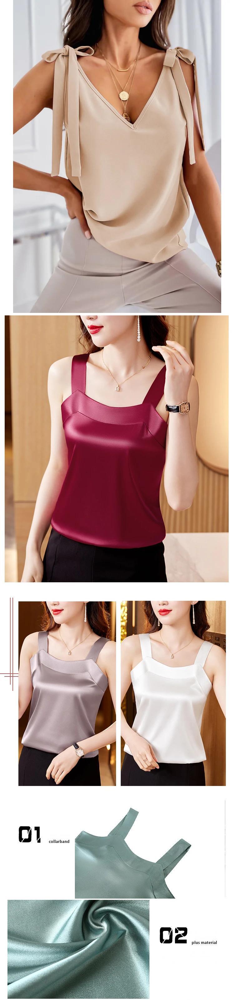 送料無料 2023 固体サテンシャツ夏スタイリッシュなノースリーブタンクトップ女性ルーズシルクトップ 26277 サマー 夏物 ソリッドカラー AE665656629862596364