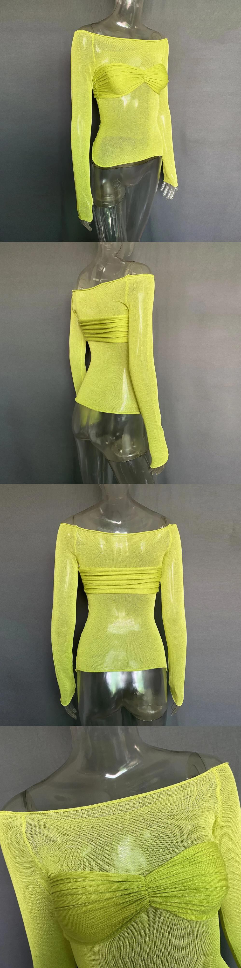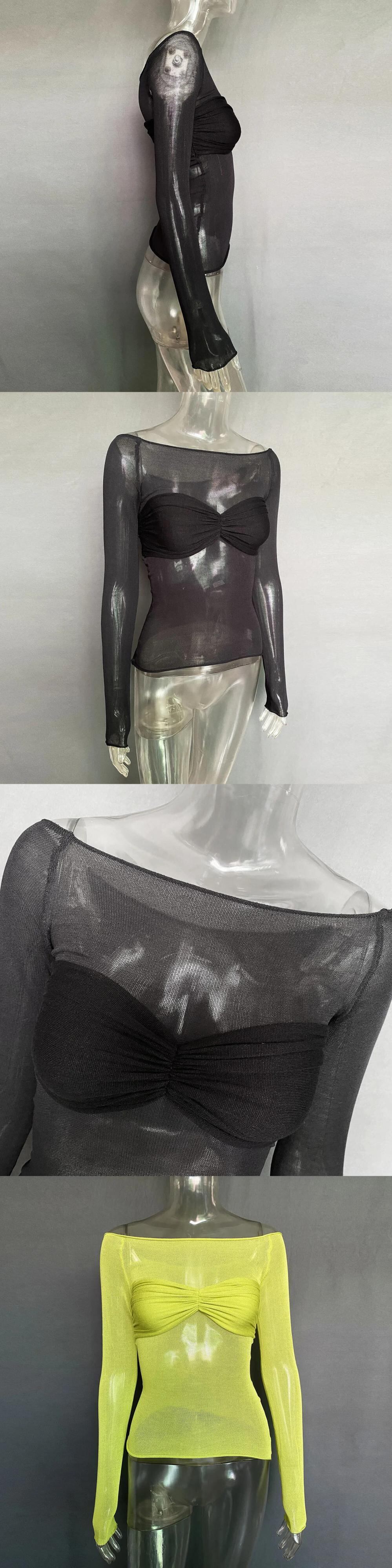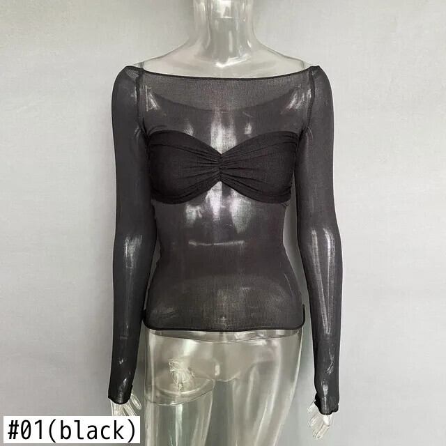 送料無料 2023 セクシーなパーティーガール Y2k Tシャツシースルーブラウス女性長袖トップスストリート Tシャツストレートカラー 24803 ロング AE665656654647442396