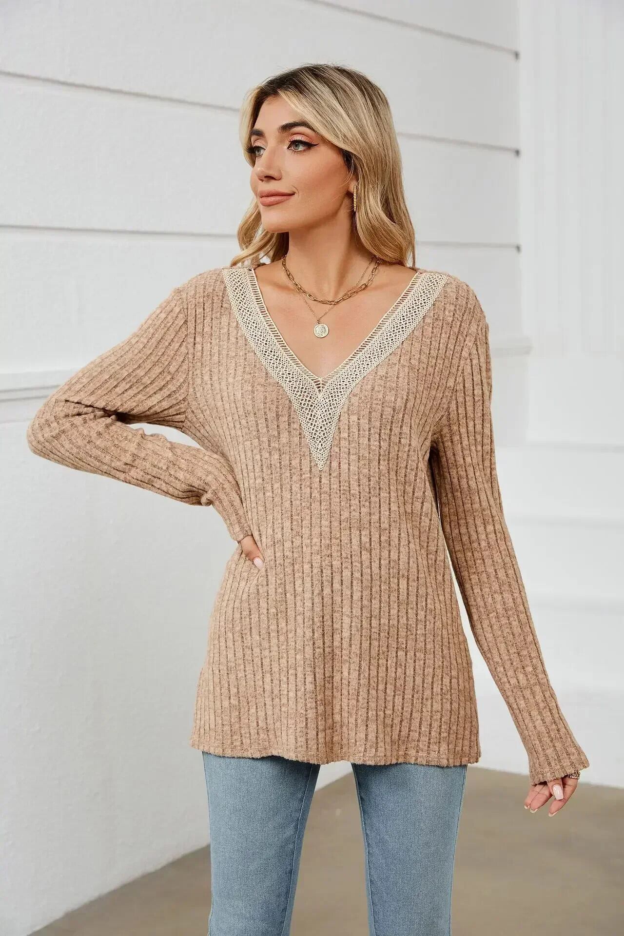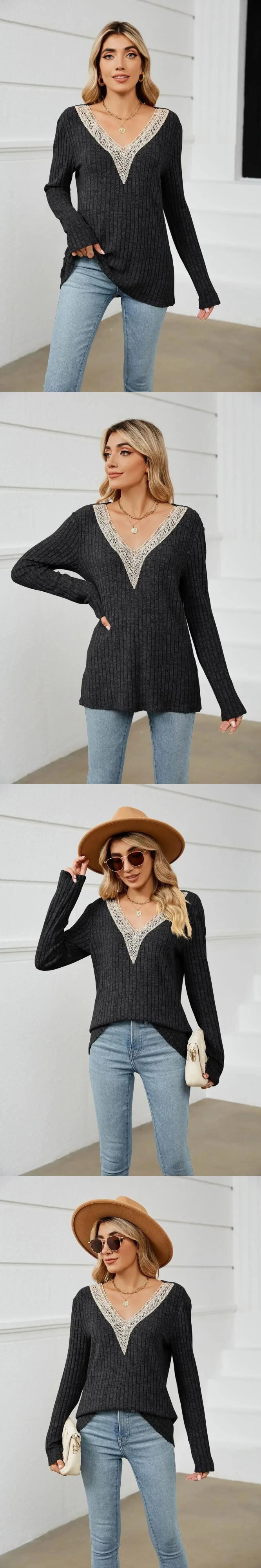 送料無料 2023 長袖女性ニット Tシャツ V ネックオフィスルーズ女性 Tシャツトップス固体シックなピットストライプスプライシング Tシャツ 30114 ロング Vネック ソリッドカラー 会社 学校 通勤や通学にも AE665656665887381581