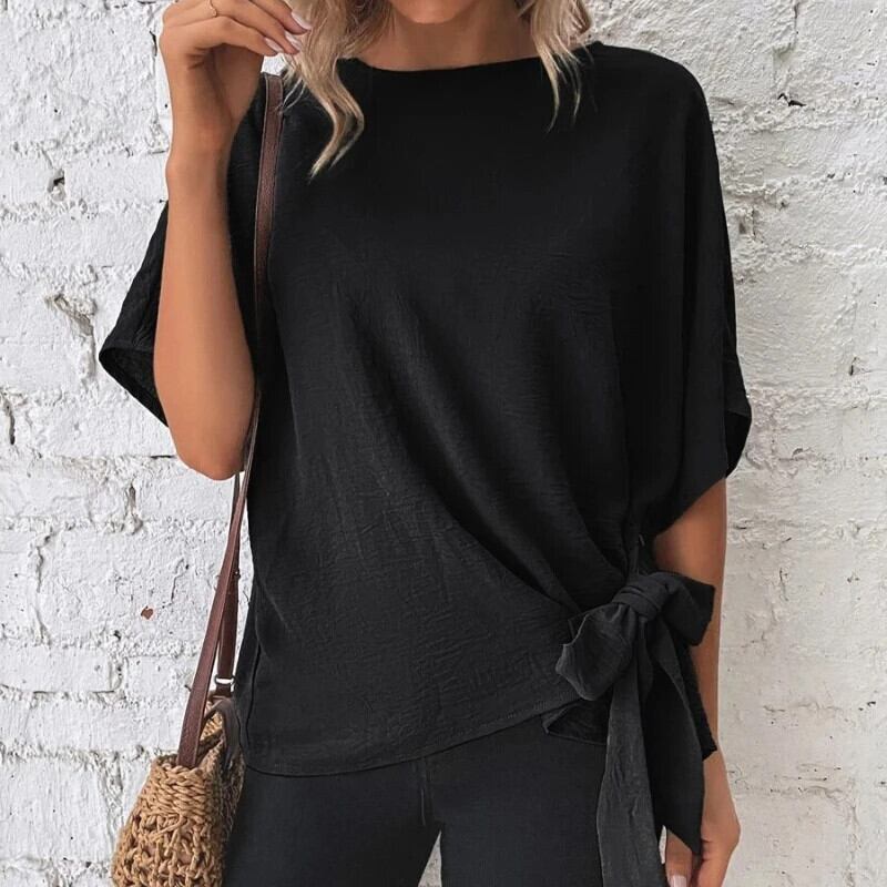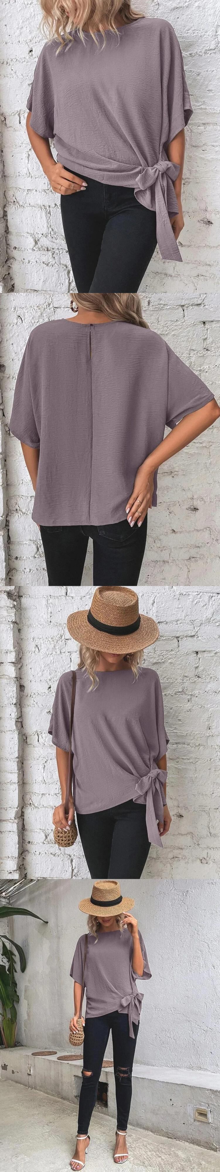 送料無料 2023 女性トップスバットウィング半袖夏 Tシャツ蝶ネクタイ女性固体 Tシャツルーズプルオーバー服 25892 リボン ハーフスリーブ サマー 夏物 ソリッドカラー AE665656633449896968