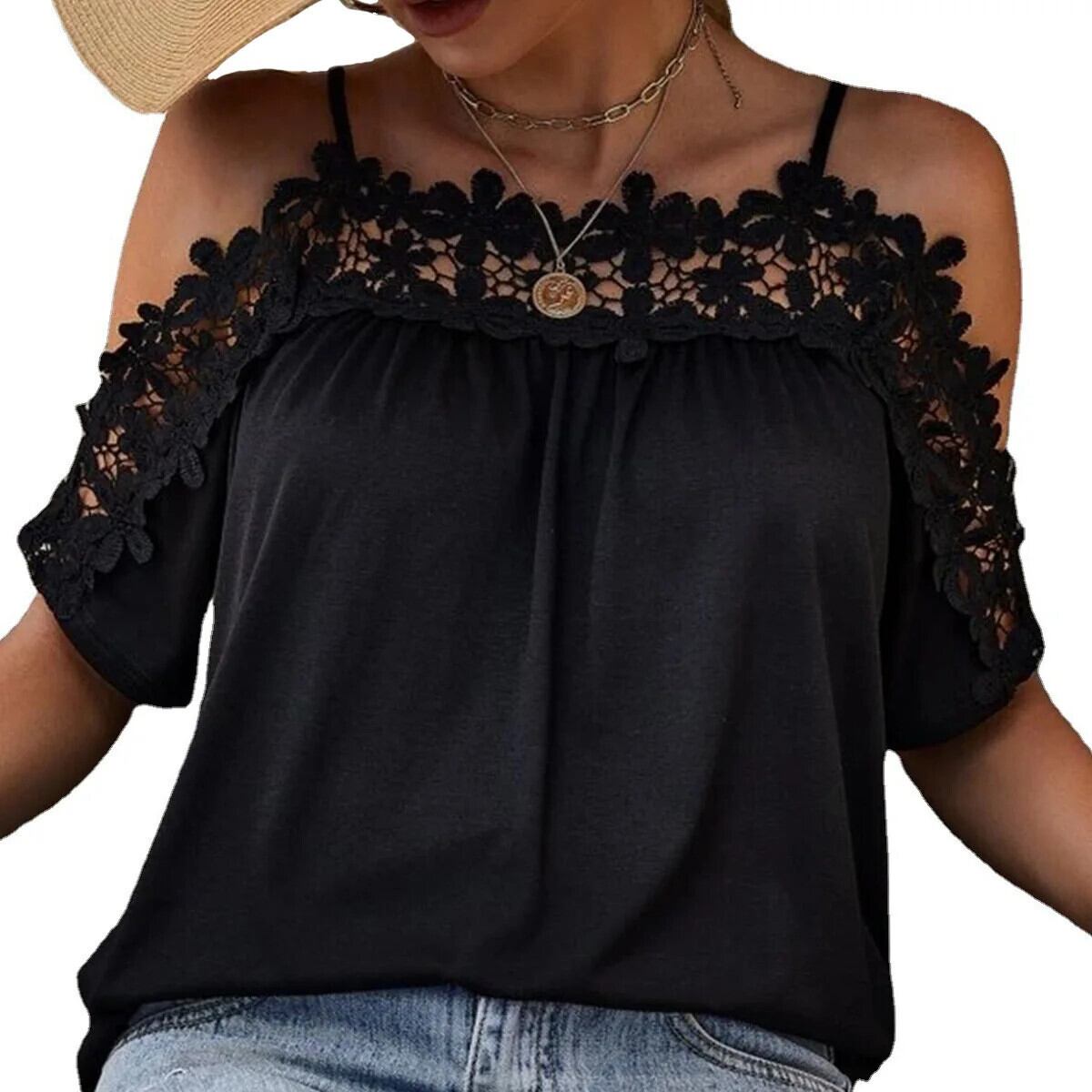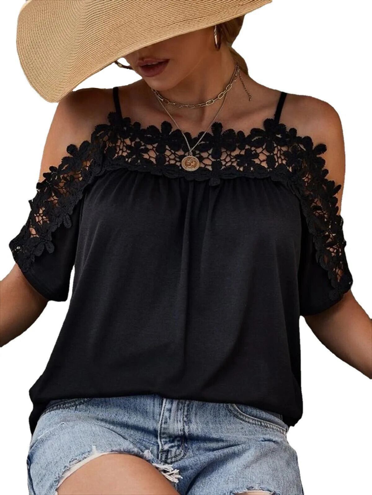送料無料 夏オフショルダーセクシーなコットンブラウス黒レースシャツ半袖女性中空アウトルーズ 2023 女性トップス 25715 ショート ブラック ハーフスリーブ サマー 夏物 AE665656682377813902