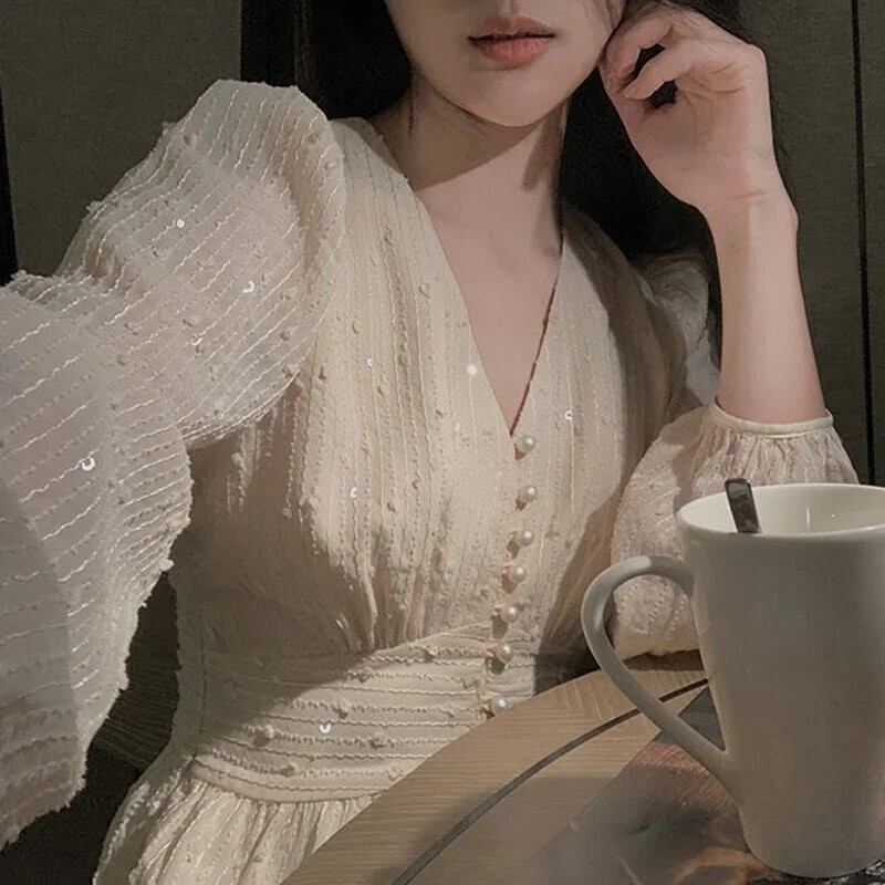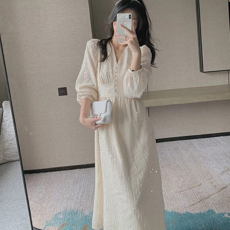 送料無料 スパンコールパーティードレスヴィンテージフレンチパフスリーブミディドレス女性 V ネック妖精のウェディングドレスローブ 20586 Vネック ビンテージ AE665656615596003201