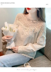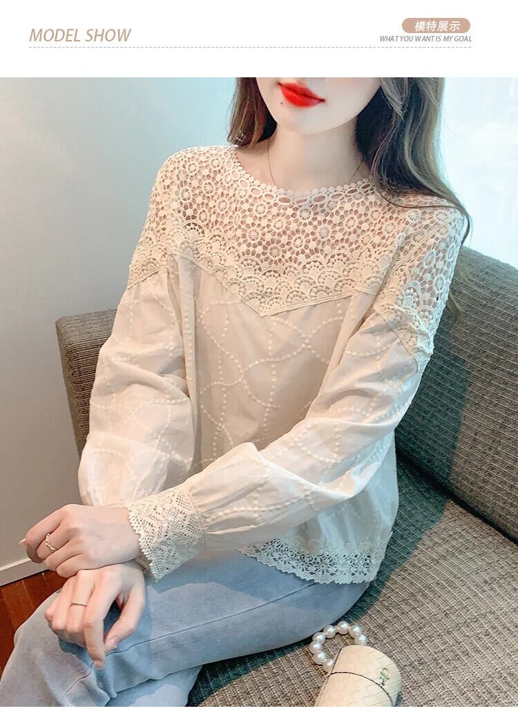 送料無料 長袖シャツ 2023 レースパッチワーク秋の女性ブラウス中空かぎ針編みルーズトップ 28775 ロング オータム 秋物 AE66565661582838420