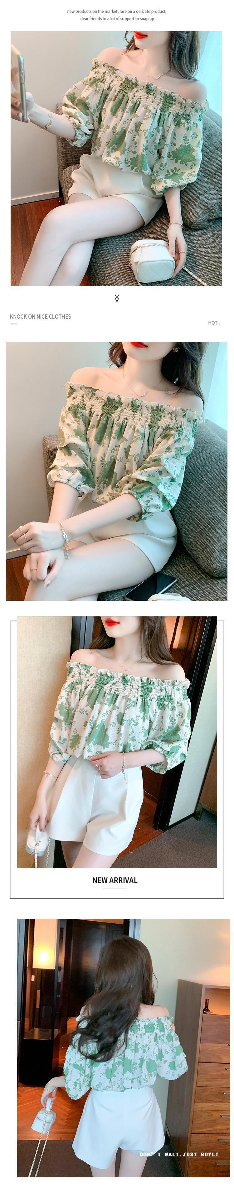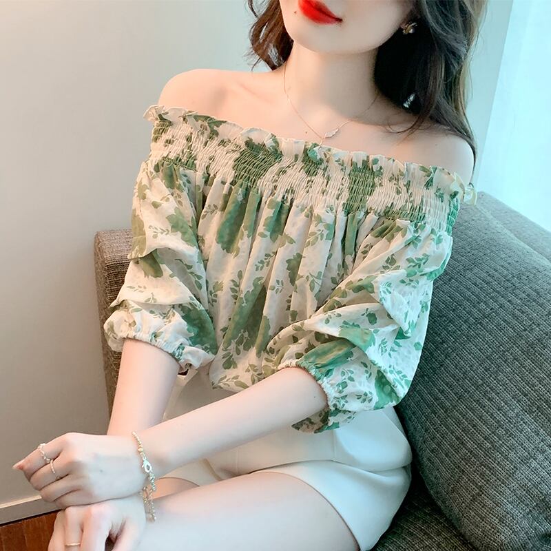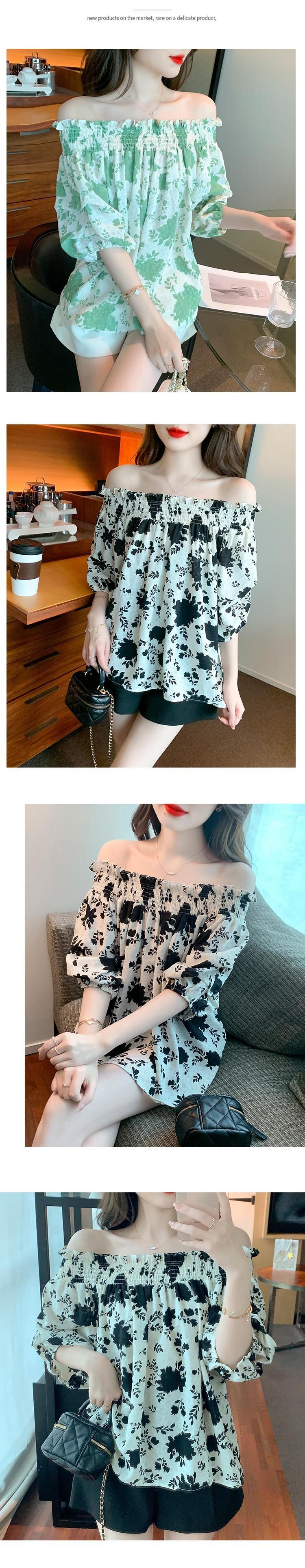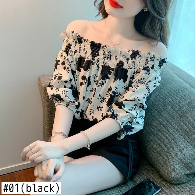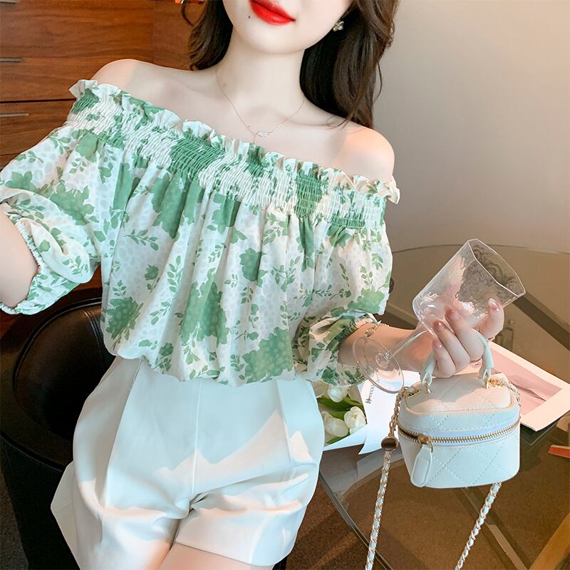 送料無料 夏オフショルダーシフォンブラウス女性 2023 フラワープリントシャツ半袖甘いトップス 26610 ショート ハーフスリーブ 大人ガーリー スウィート キュート カジュアル サマー 夏物 フラワーデザイン AE665656668999616001