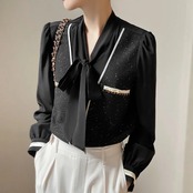 送料無料 シルク女性シャツ長袖女性ブラウスリボン付きオフィスレディシックトップス 25416 ロング 会社 学校 通勤や通学にも AE665656615499306438