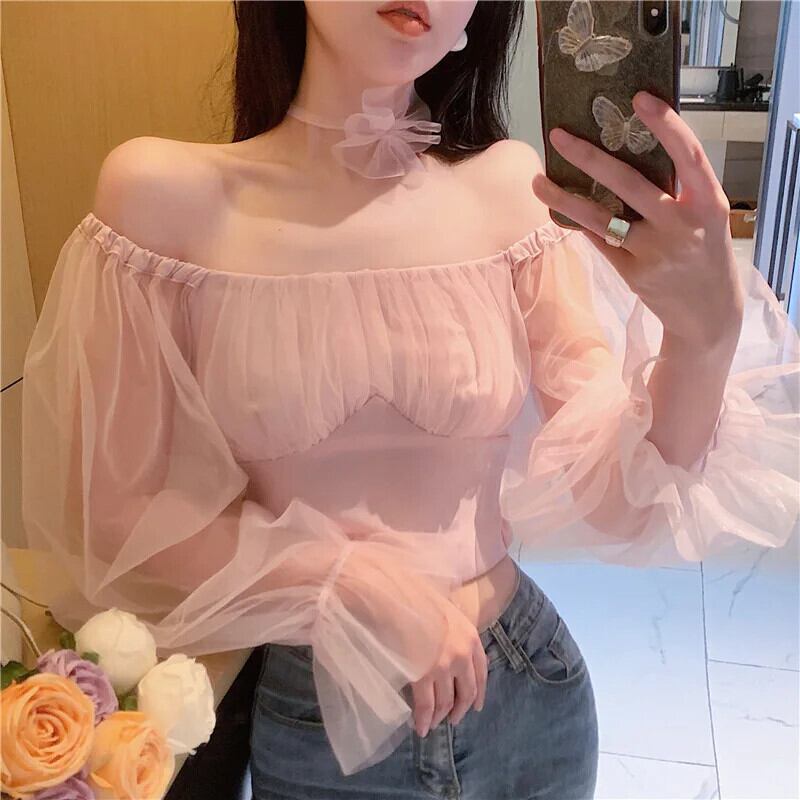 送料無料 セクシーなシースルーシフォンブラウス女性オフショルダーランタン長袖シャツ 2023 甘いショート 26562 ロング 大人ガーリー スウィート キュート カジュアル AE665656644471125474