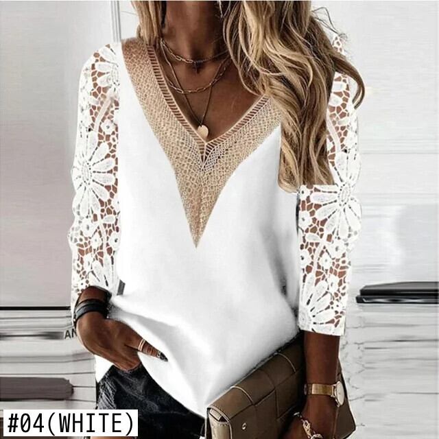 送料無料 V ネックレースステッチ女性ブラウス長袖トップス 2024 春中空アウトヴィンテージシャツ緩い服 25948 ロング スプリング 春物 Vネック ビンテージ AE66565664924031914