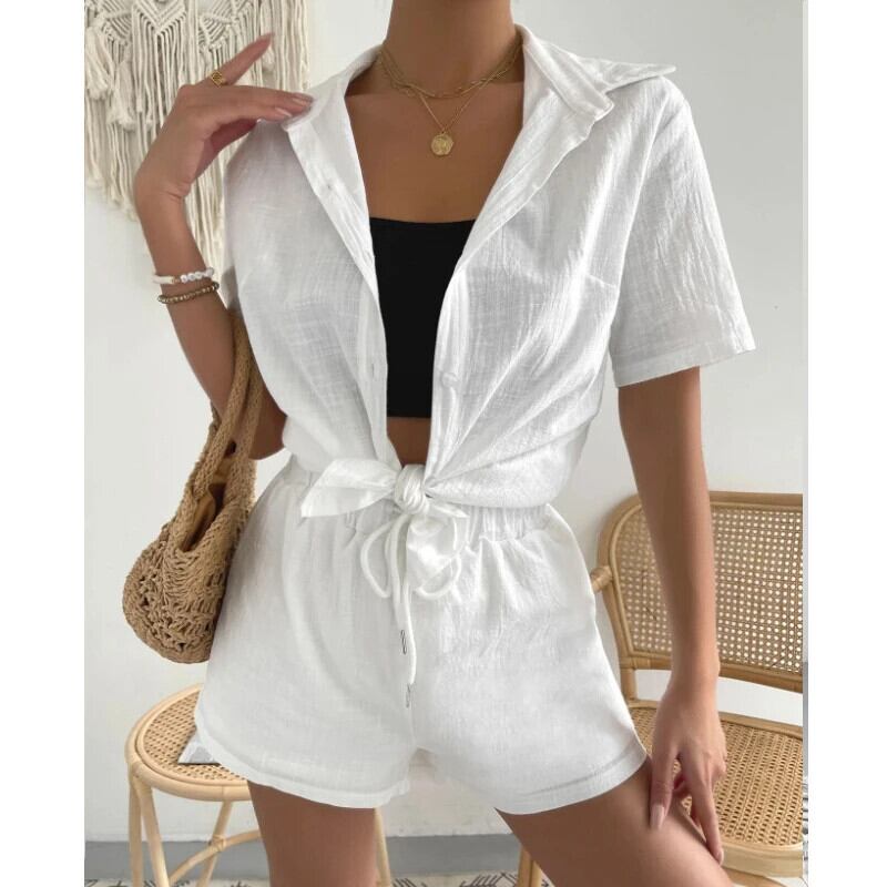 送料無料 夏半袖巾着コットンリネンシャツとワイドレッグショーツの2点セットルーズ衣装ルーズ2ピーススーツ26301 ショート ハーフスリーブ サマー 夏物 ブルマー ワイドパンツ AE665656680777155402
