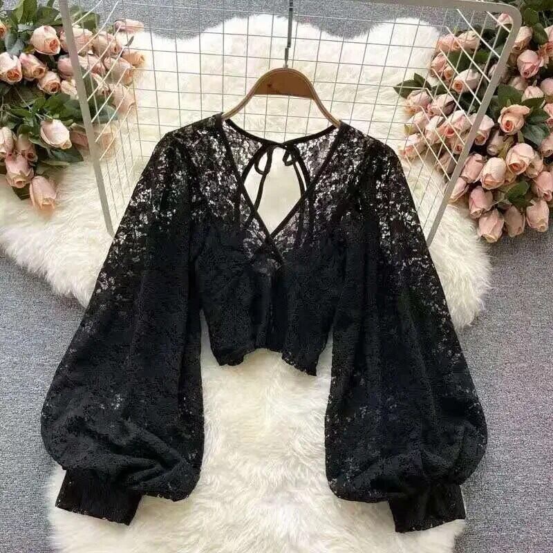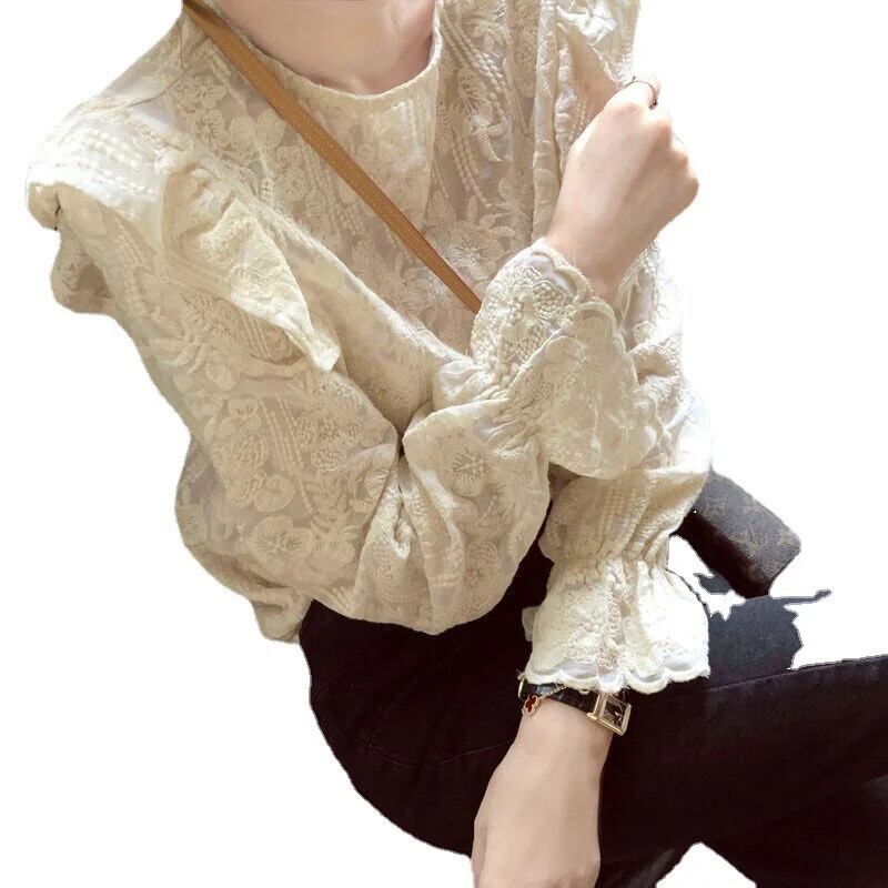 送料無料 フリルレースブラウス春 O ネックトップスフレア長袖甘いシャツかぎ針編み中空花ヴィンテージ服 25847 ロング ラッフル 大人ガーリー スウィート キュート カジュアル スプリング 春物 花柄 Oネック ビンテージ AE665656625745242742