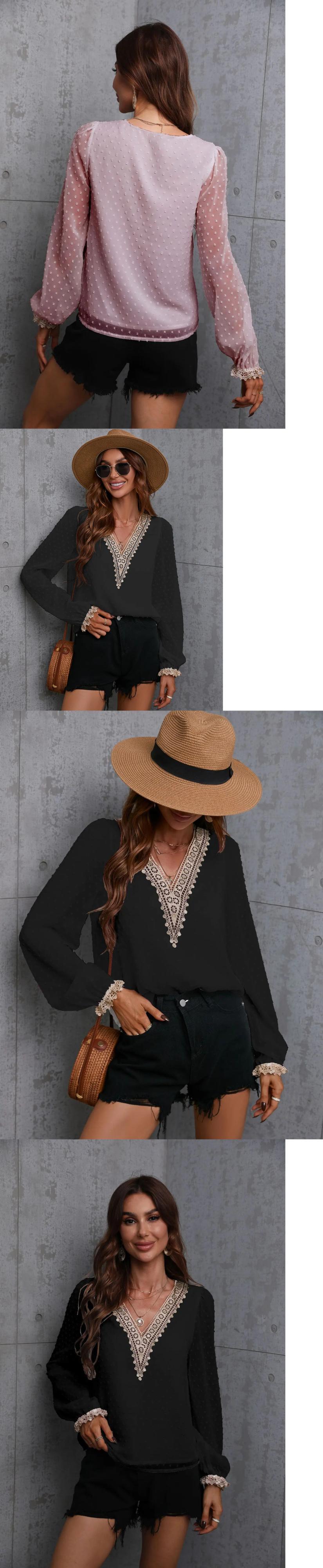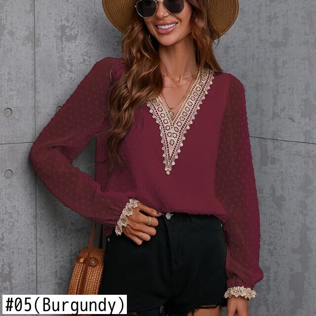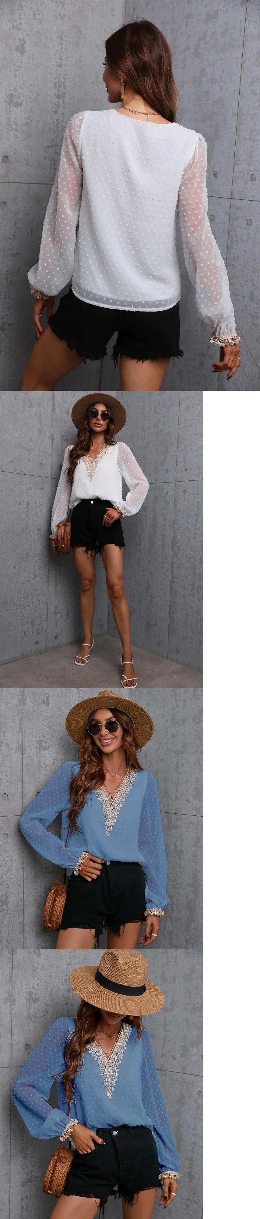 送料無料 2023 春白シフォン女性ブラウス長袖オフィスレディシャツレーストップスドット固体長袖シャツ 24890 ロング ホワイト スプリング 春物 ソリッドカラー 会社 学校 通勤や通学にも AE665656696172941093