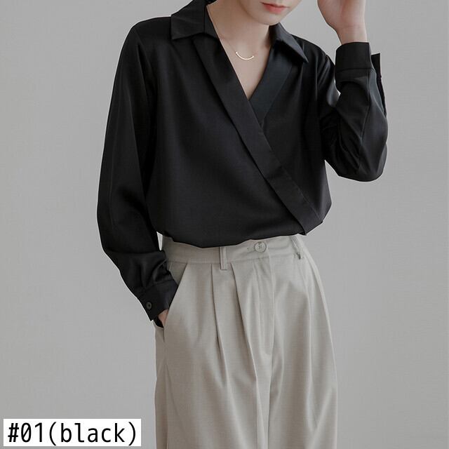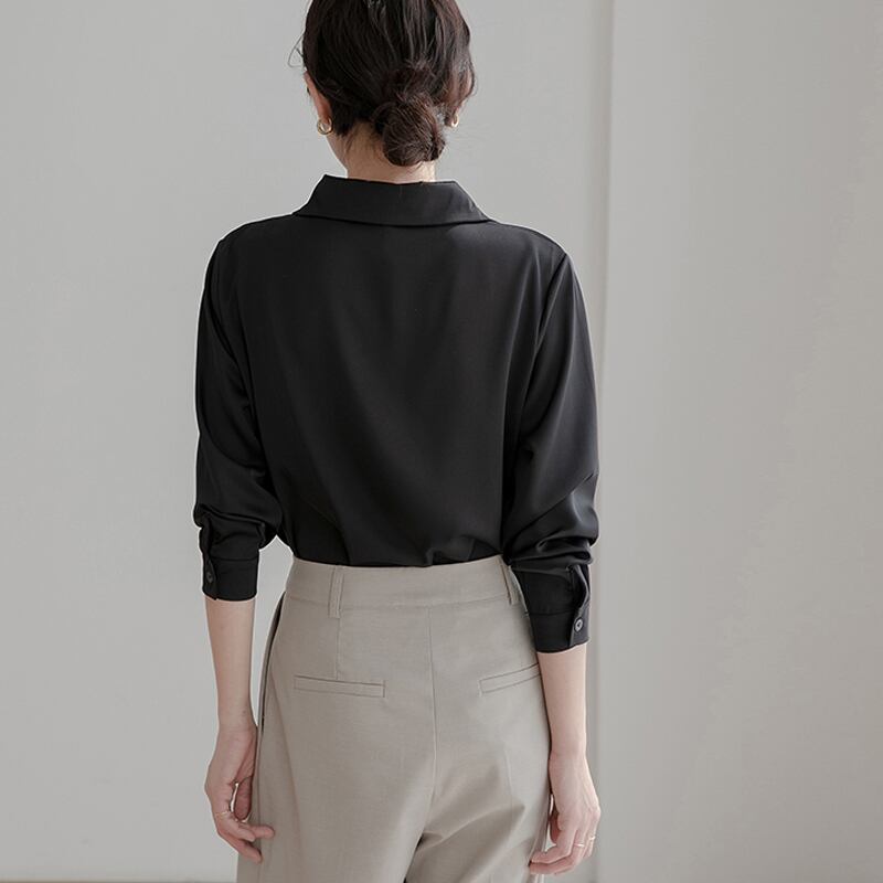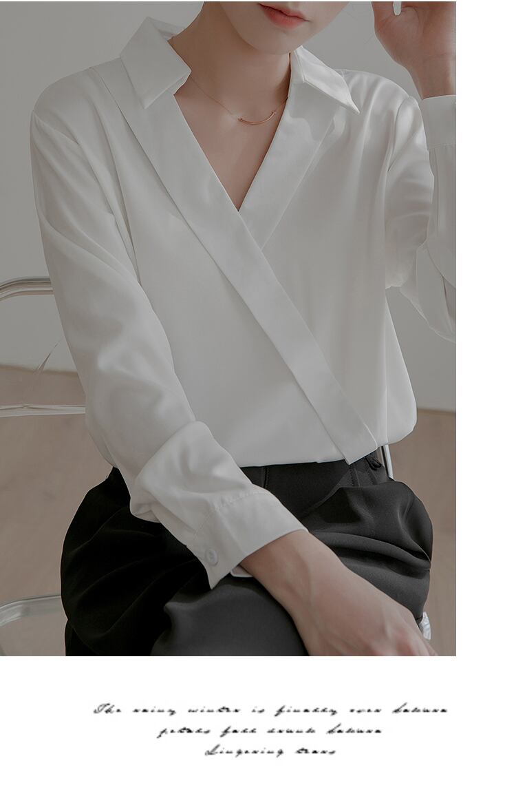 送料無料 ホワイトサテンブラウスルーズ女性服オフィスレディ V ネック無地トップス長袖シャツ 28377 ロング Vネック ソリッドカラー 会社 学校 通勤や通学にも AE66565668788859038