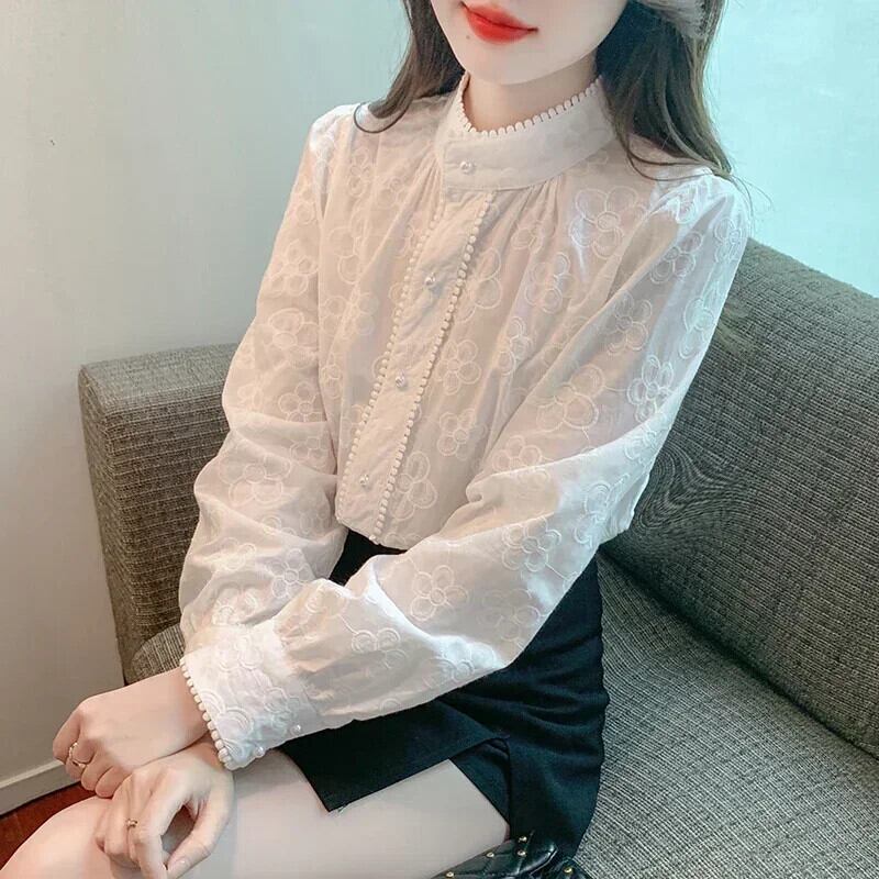 送料無料 2023 長袖シャツ甘いかぎ針編みの花の女性の秋のオフィスレディ底トップスボタンブラウス 29630 ロング 大人ガーリー スウィート キュート カジュアル オータム 秋物 フラワーデザイン 会社 学校 通勤や通学にも AE665656675710546449 | 女性の為の通販サイト-fashion navi