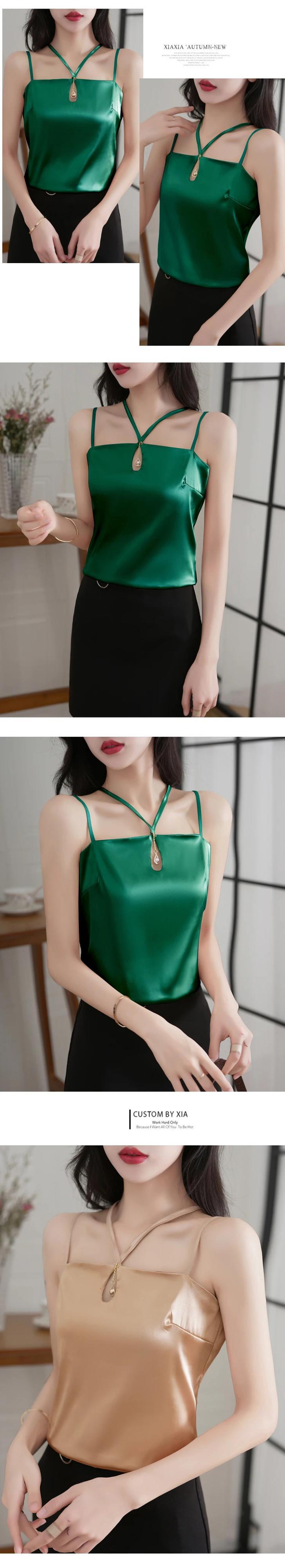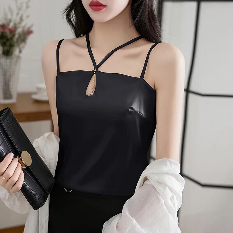 送料無料 2023 夏のセクシーなサテンタンクトップ女性ホルターソリッドカットアウトシルクキャミソール若者シャツ緩い服 25518 サマー 夏物 ソリッドカラー AE665656677395616958