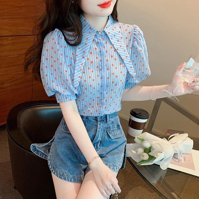 送料無料 夏ヴィンテージドットプリントショートパフスリーブブラウス 2023 スタイリッシュなターンダウンカラー甘いシャツブルートップス 27484 大人ガーリー スウィート キュート カジュアル サマー 夏物 ビンテージ AE665656692778260611