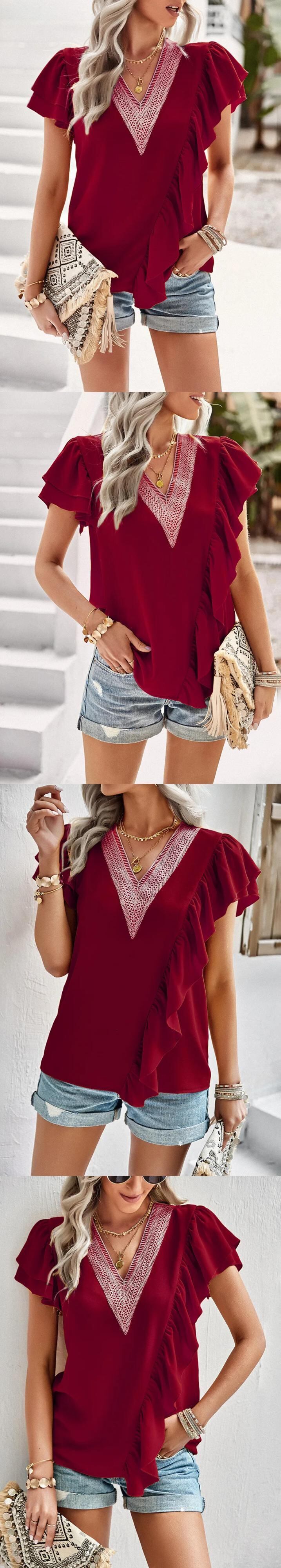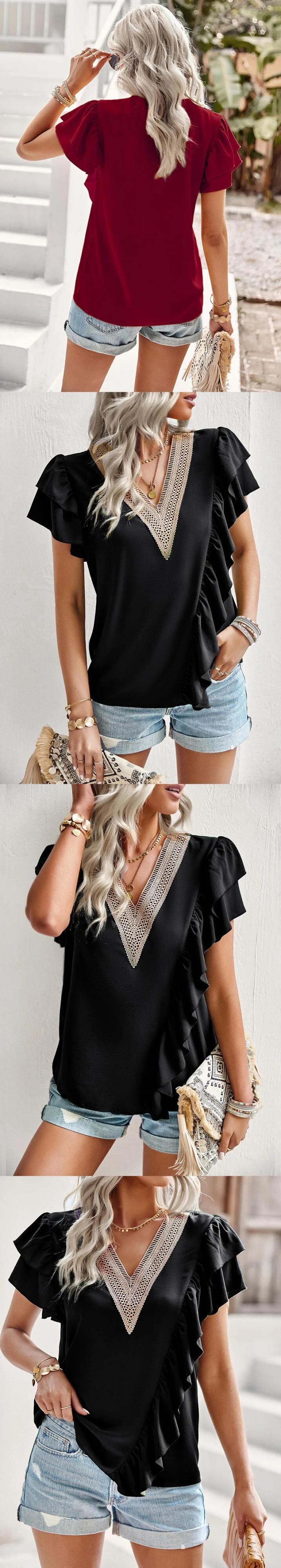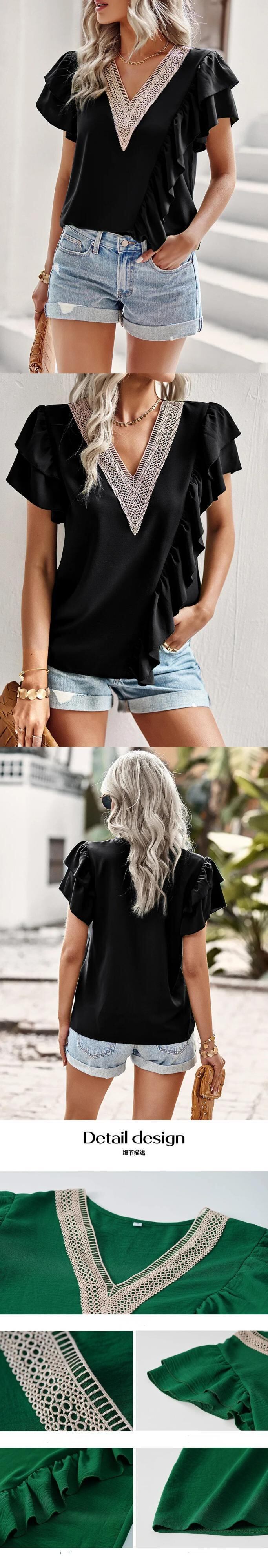 送料無料 2023 女性ブラウスルーズオフィススタイリッシュな夏半袖フリル V ネックレースシャツトップ 25891 ショート ハーフスリーブ ラッフル サマー 夏物 Vネック 会社 学校 通勤や通学にも AE665656635934076961