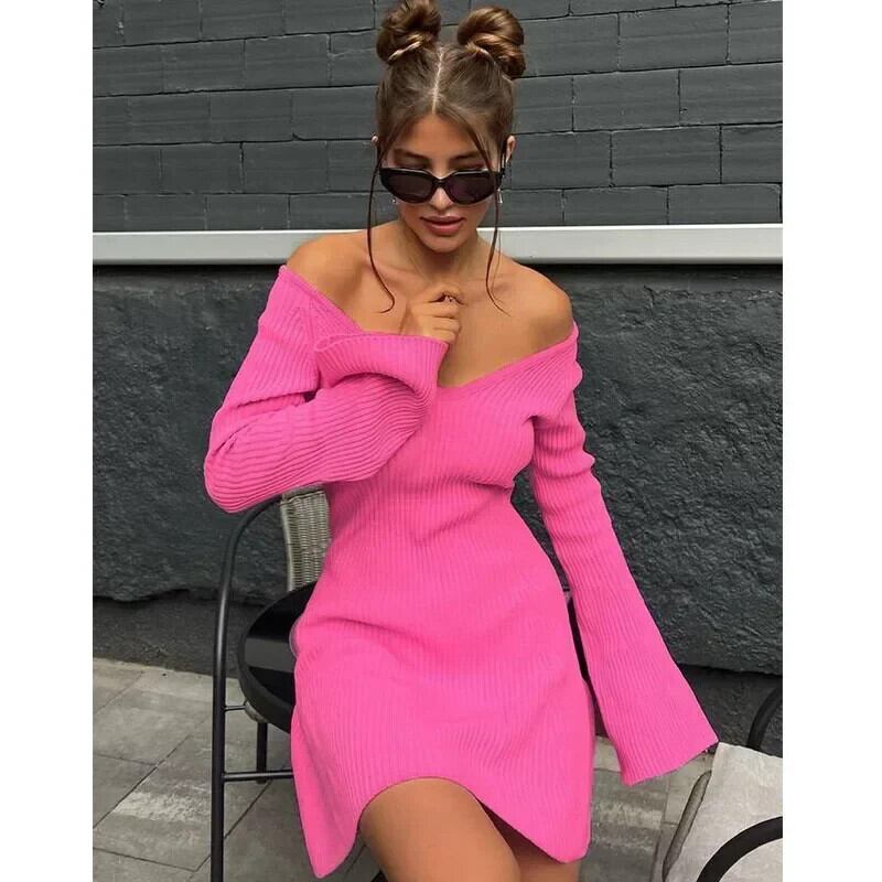 送料無料 秋ベース A ラインフリルセータードレス冬のセクシーなニット V ネック長袖ねじ糸ショートドレス女性 30181 ロング オータム 秋物 ウィンター 冬物 Vネック Aライン AE665656613193149802