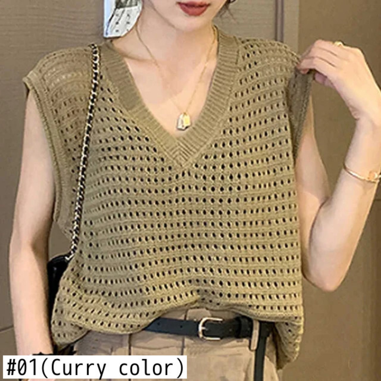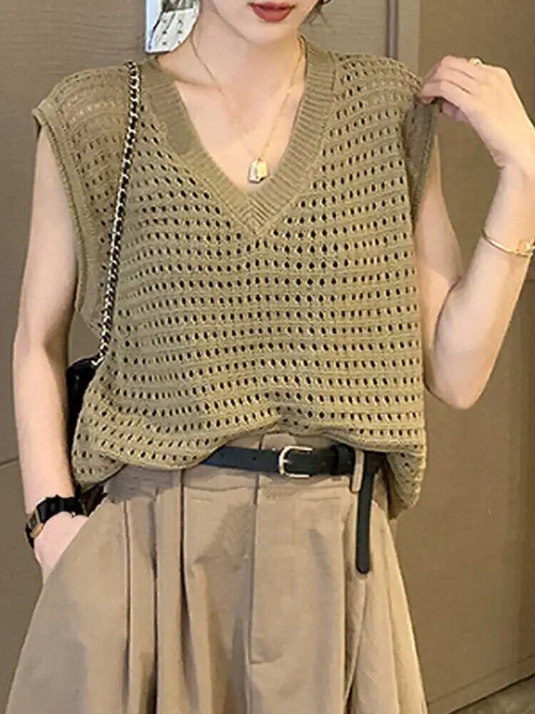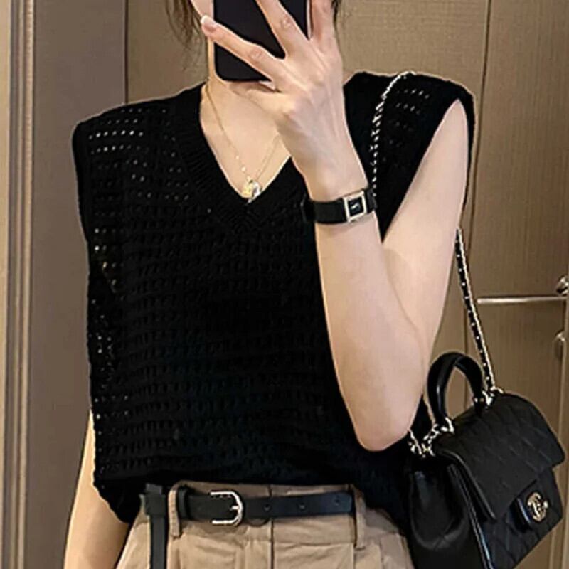 送料無料 女性タンクトップノースリーブ V ネックアイスシルクシャツ夏薄い生き抜くニットブラウス中空ルーズ Tシャツ 27089 サマー 夏物 Vネック AE665656615794837494
