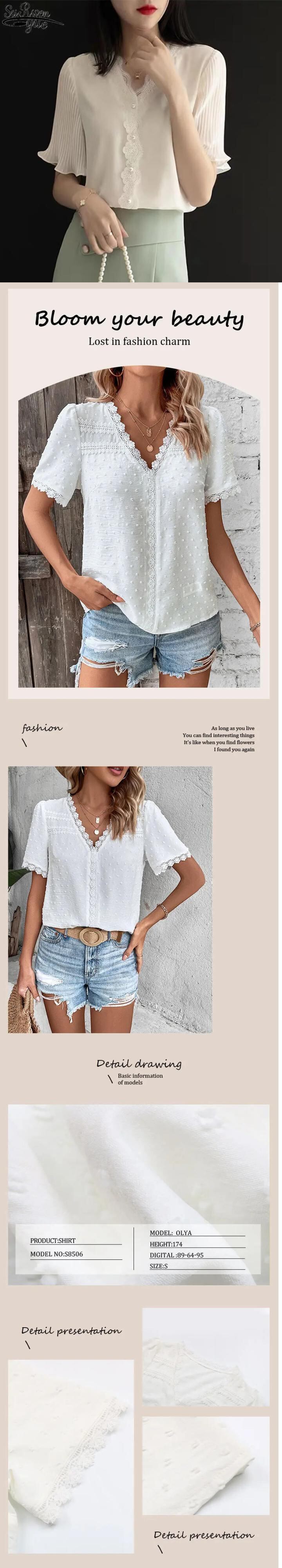 送料無料 2023 半袖トップス夏の V ネック白人女性ブラウスヴィンテージルーズパフスリーブレースシャツ女性 27122 ショート ホワイト ハーフスリーブ サマー 夏物 Vネック ビンテージ AE665656615495473831