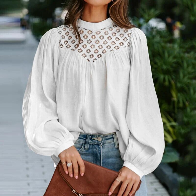 送料無料 花中空長袖シャツヴィンテージプリーツルーズトップス女性服秋スタンドカラーホワイトレースブラウス 28415 ロング オータム 秋物 花柄 ビンテージ AE665656611372153153