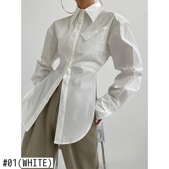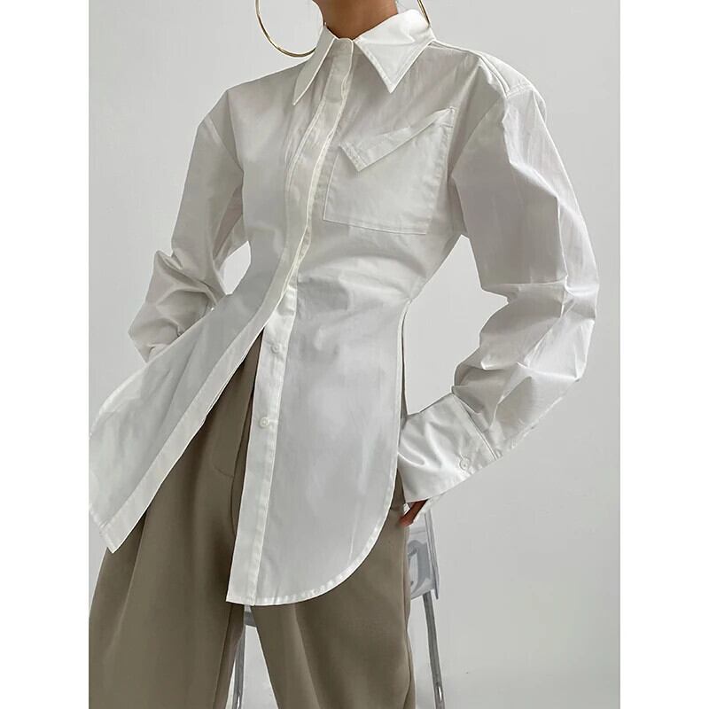 送料無料 スプリットシックな白シャツ女性長袖スリムコットンヴィンテージブラウス女性ポケットオフィスレディトップスボタンシャツ 22987 ロング ホワイト ビンテージ 会社 学校 通勤や通学にも AE665656617187499962