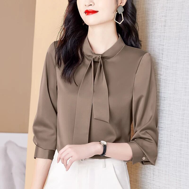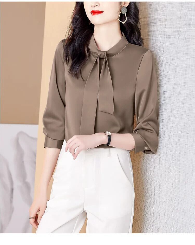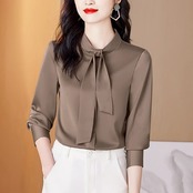 送料無料 オフィスレディ長袖レディースシャツリボン付きシンプルサテンレディースブラウストップス24483 ロング 会社 学校 通勤や通学にも AE665656646046642829