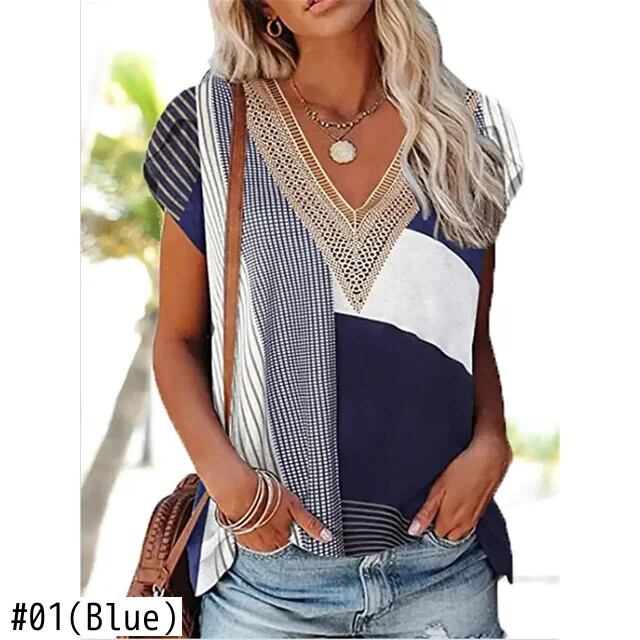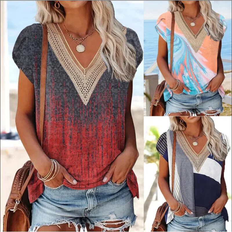 送料無料 2023 スタイリッシュな Tシャツ夏半袖女性ブラウス V ネックレースプリントシャツトップルーズ 26166 ショート ハーフスリーブ サマー 夏物 Vネック AE665656646304657790