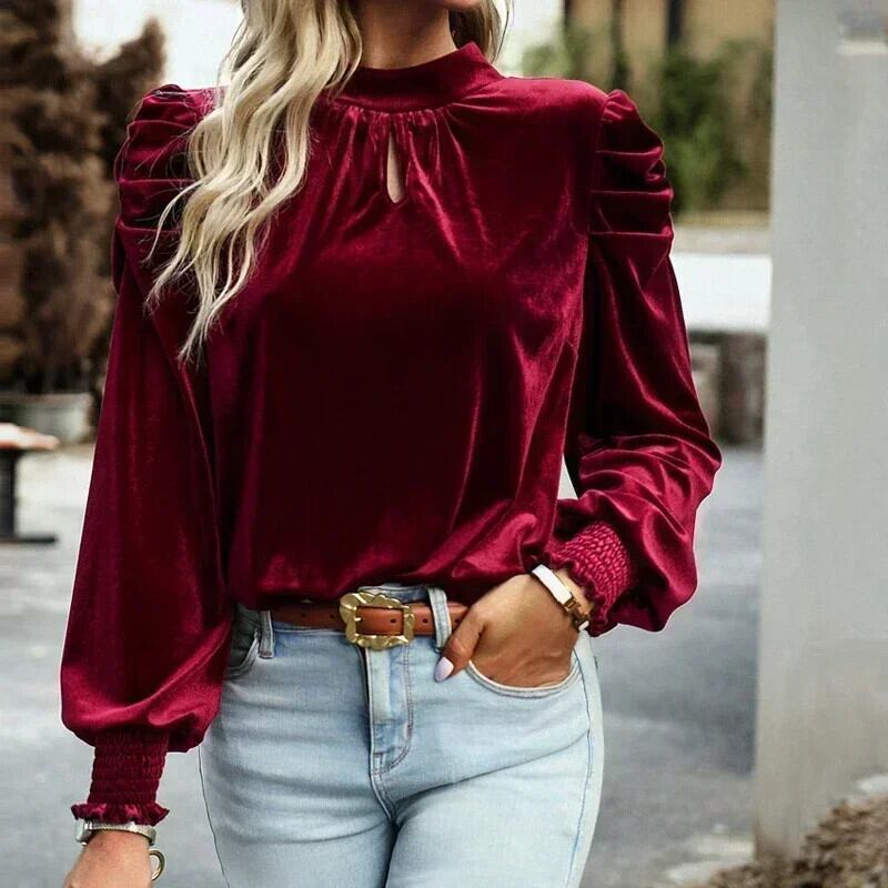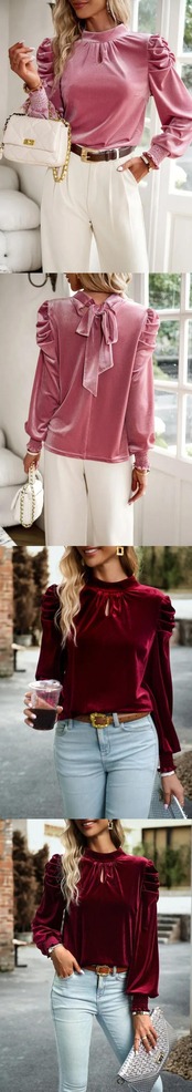 送料無料 女性半襟シンプルなベルベットブラウス秋のレースアップボウパフ長袖シャツヴィンテージ女性プリーツトップス 30299 ロング リボン オータム 秋物 ビンテージ AE665656695702717819