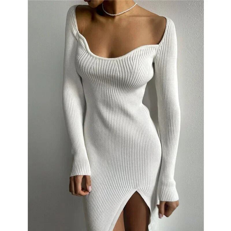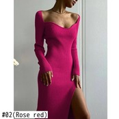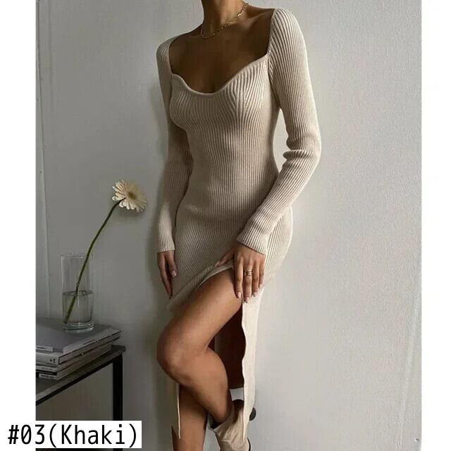 送料無料 衣装セクシーな固体ミディドレス秋冬スクエアカラーリブニットスリットドレス女性服 30170 オータム 秋物 ウィンター 冬物 ソリッドカラー スクウェア AE66565666583465364