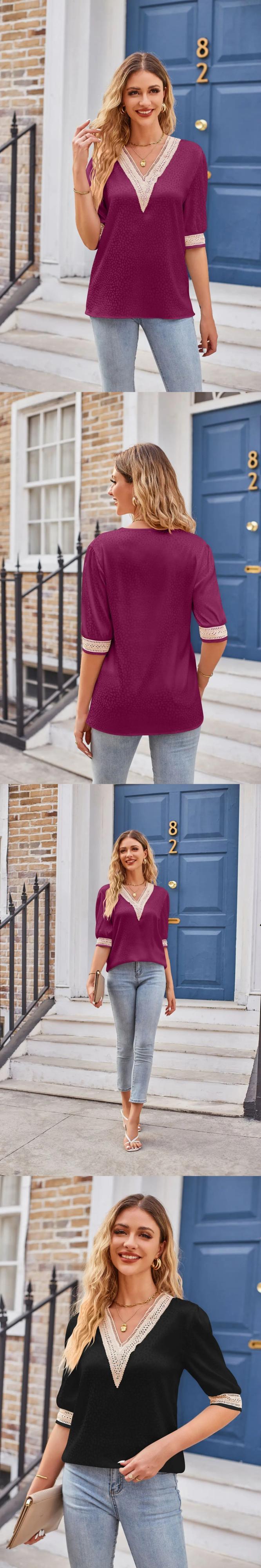 送料無料 2023 夏半袖シャツ V ネックレースヒョウ柄サテンブラウス女性シルクトップ 26148 ハーフスリーブ サマー 夏物 Vネック AE665656664060984745