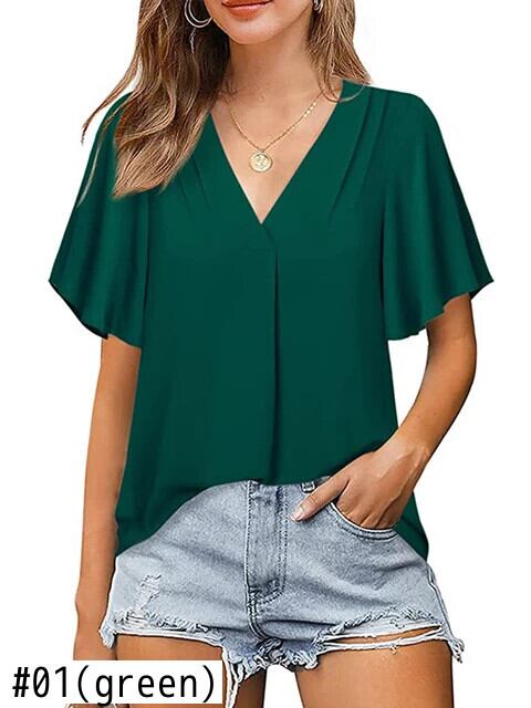 送料無料 夏 V ネックフレア半袖シフォンブラウス女性ブラウス女性 2023 ルーズトップス固体シャツ 24905 ショート ハーフスリーブ サマー 夏物 Vネック ソリッドカラー AE665656696648821293