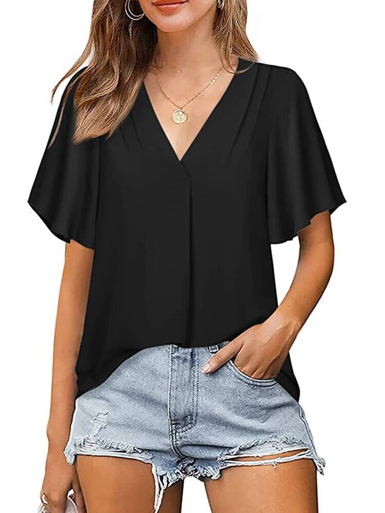 送料無料 夏 V ネックフレア半袖シフォンブラウス女性ブラウス女性 2023 ルーズトップス固体シャツ 24905 ショート ハーフスリーブ サマー 夏物 Vネック ソリッドカラー AE665656696648821293 | 女性の為の通販サイト-fashion navi