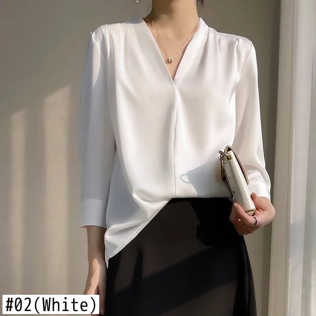 送料無料 2023 V ネックルーズシャツ無地トップスオフィスレディ Slik サテンブラウス長袖女性シャツ 25586 ロング Vネック ソリッドカラー 会社 学校 通勤や通学にも AE665656697842714951