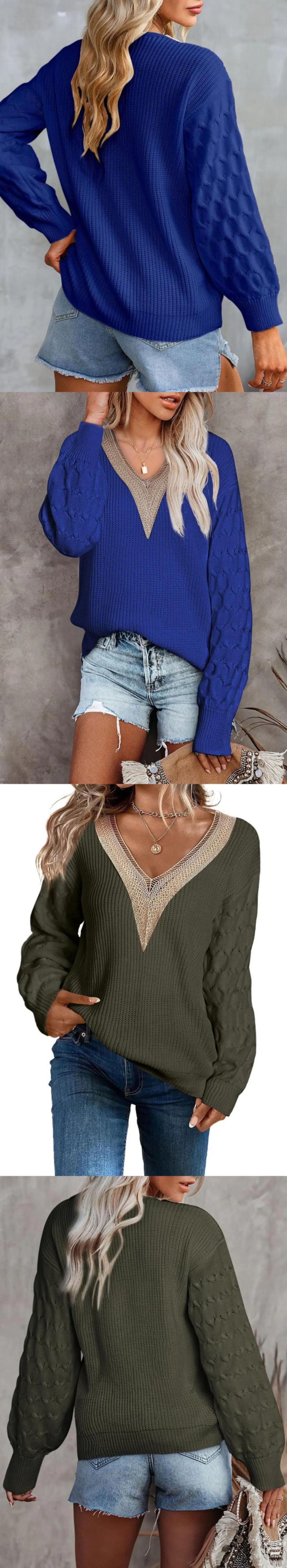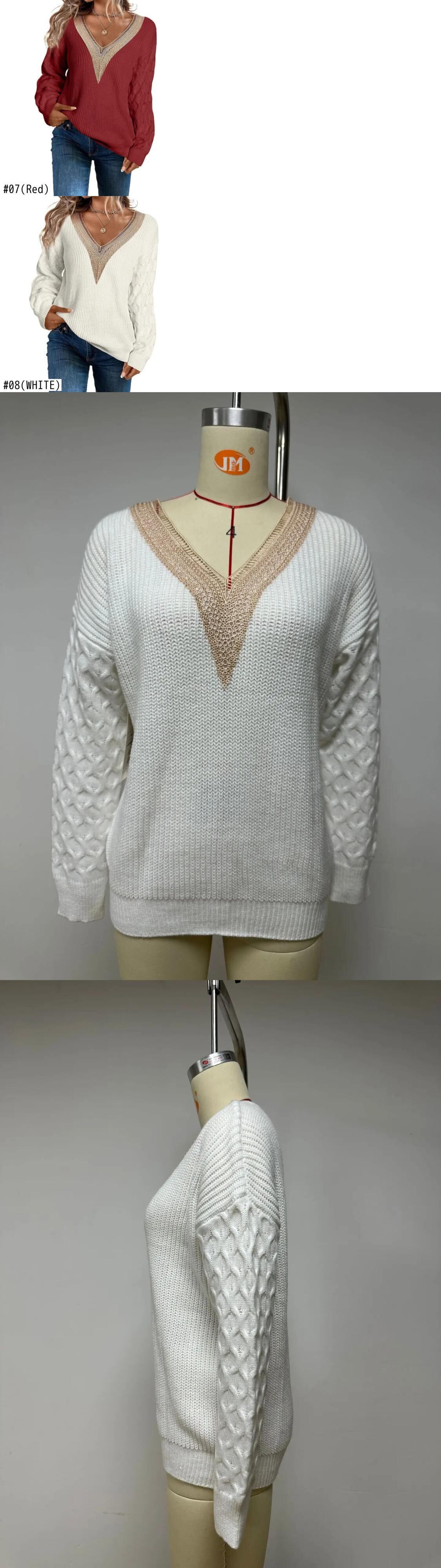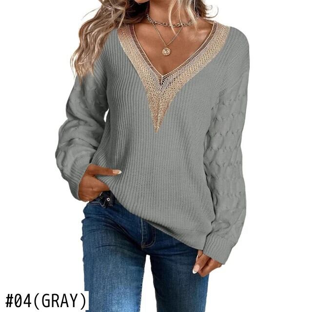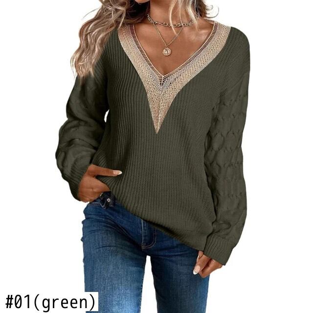 送料無料 オフィスレディ長袖セーター秋冬セクシーなレース V ネックニットトップス女性プルオーバー服 28966 ロング オータム 秋物 ウィンター 冬物 Vネック 会社 学校 通勤や通学にも AE665656617142407244