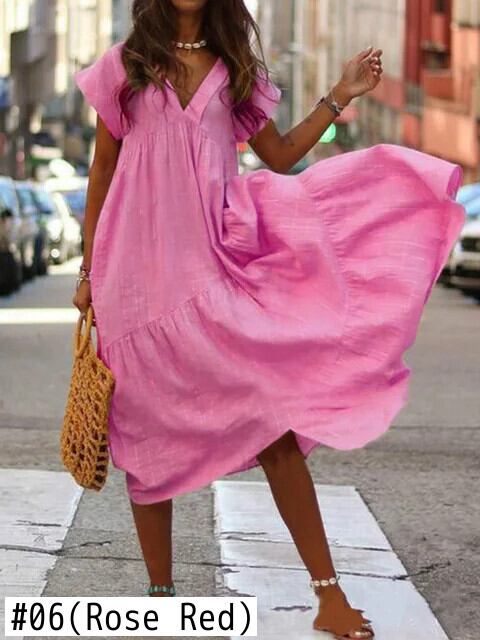 送料無料 夏のレディース半袖サンドレス 2023 V ネック Vestidos ソリッドルーズフリルロングドレス 28074 ショート ハーフスリーブ サマー 夏物 Vネック ソリッドカラー AE665656646704364791