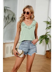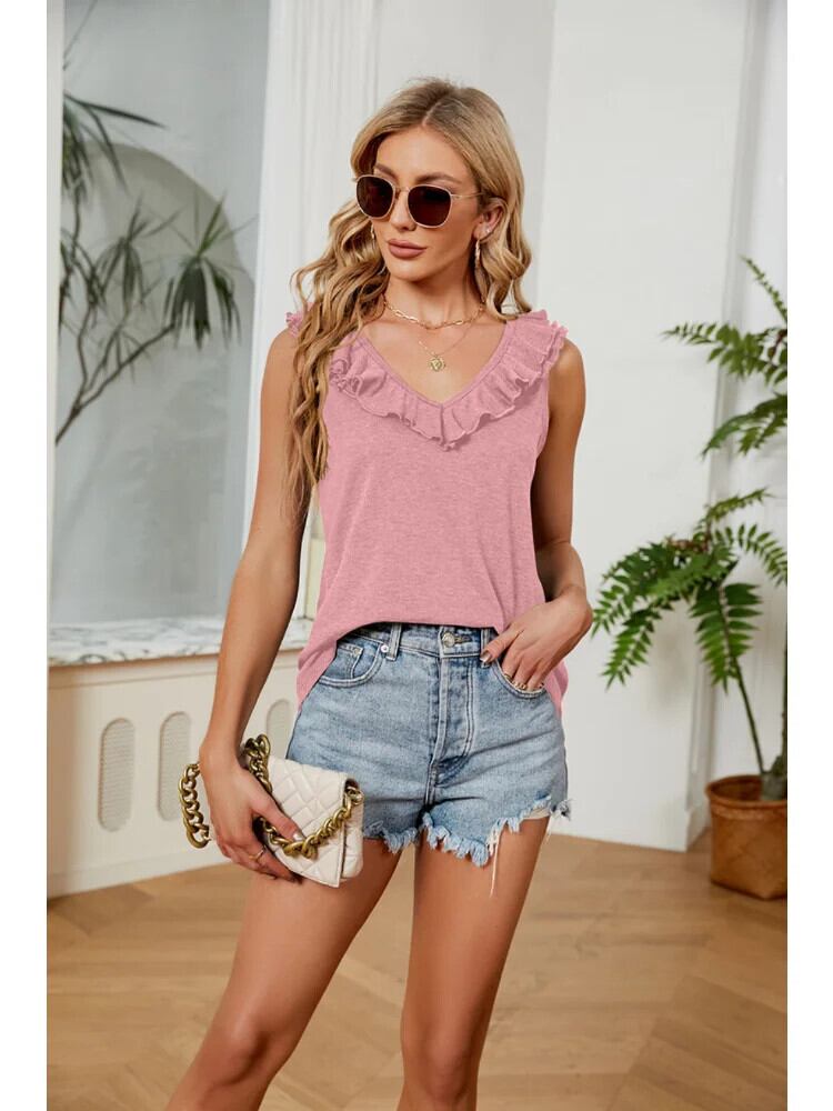 送料無料 2023 夏フリル V ネックノースリーブベストブラウス女性ルーズソリッド甘いピンクシャツパラ 25153 大人ガーリー スウィート キュート カジュアル サマー 夏物 Vネック ソリッドカラー AE665656633865193991