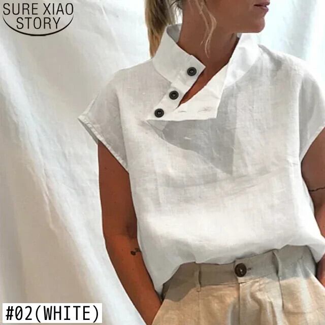 送料無料 半袖女性ブラウス 2024 夏コットンリネンシャツルーズ固体白チュニックトップス 18898 ショート ホワイト ハーフスリーブ サマー 夏物 ソリッドカラー AE665656681113552770
