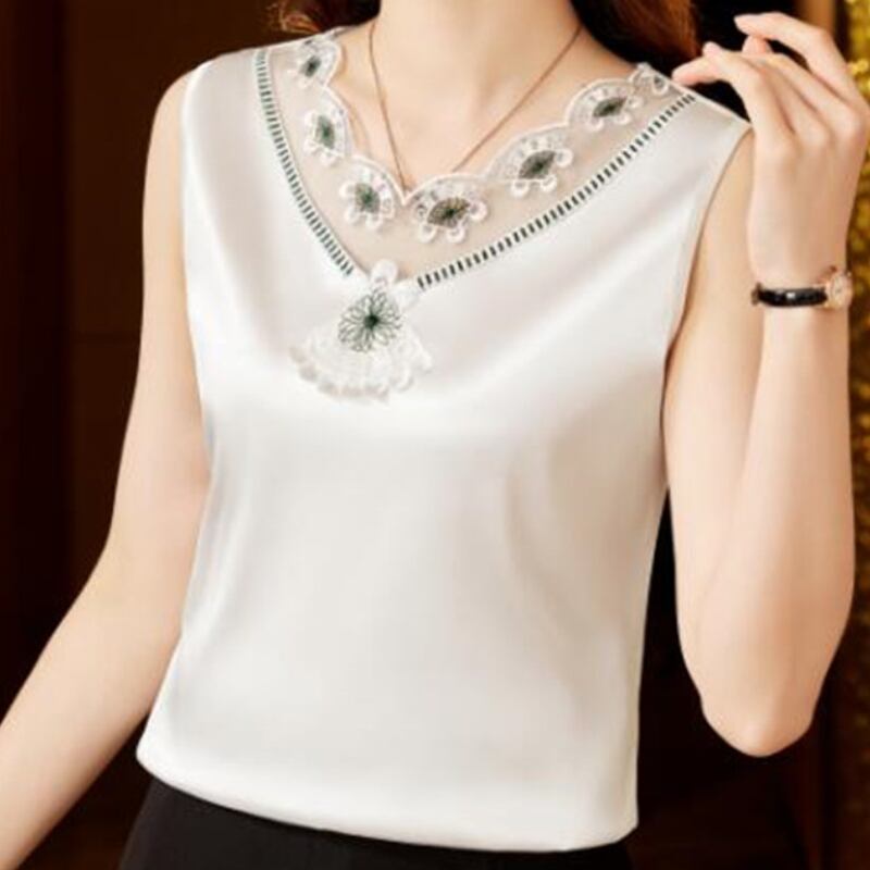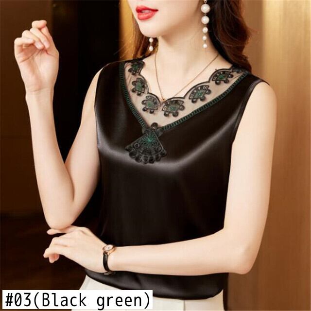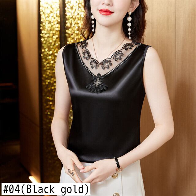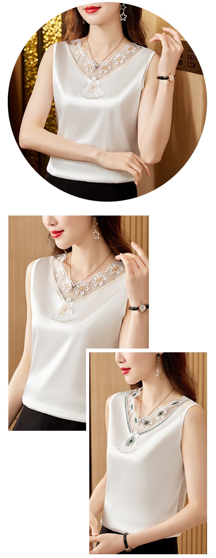送料無料 2023 ユースルーズ V ネックトップレース刺繍サテンブラウス女性ノースリーブベストシャツシルク 26086 レッド Vネック AE665656617234883530