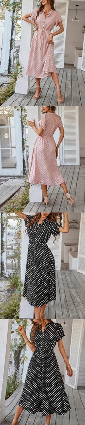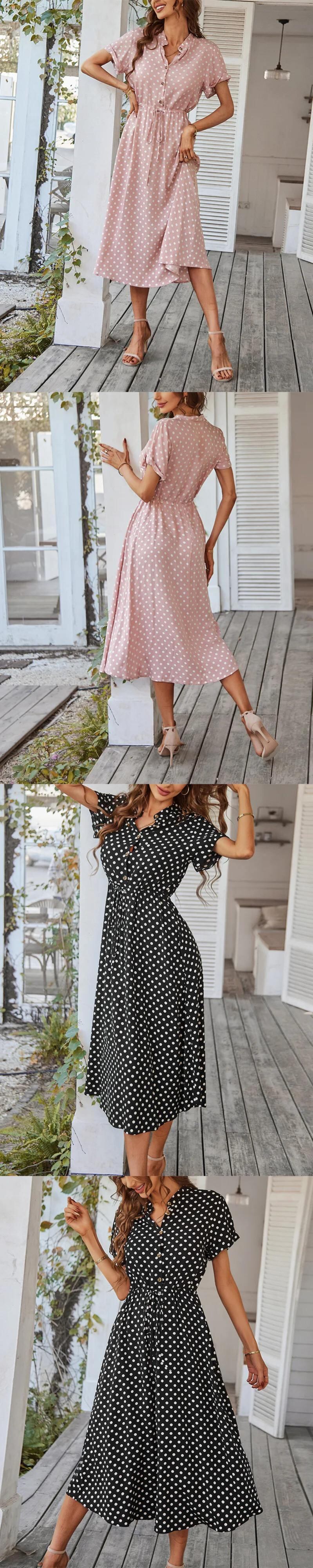 送料無料 夏の半袖パーティードレスの女性 2023 ラペルボタンウェーブドットプリントレースアップロングドレス 28000 ショート ハーフスリーブ サマー 夏物 AE665656697340823664