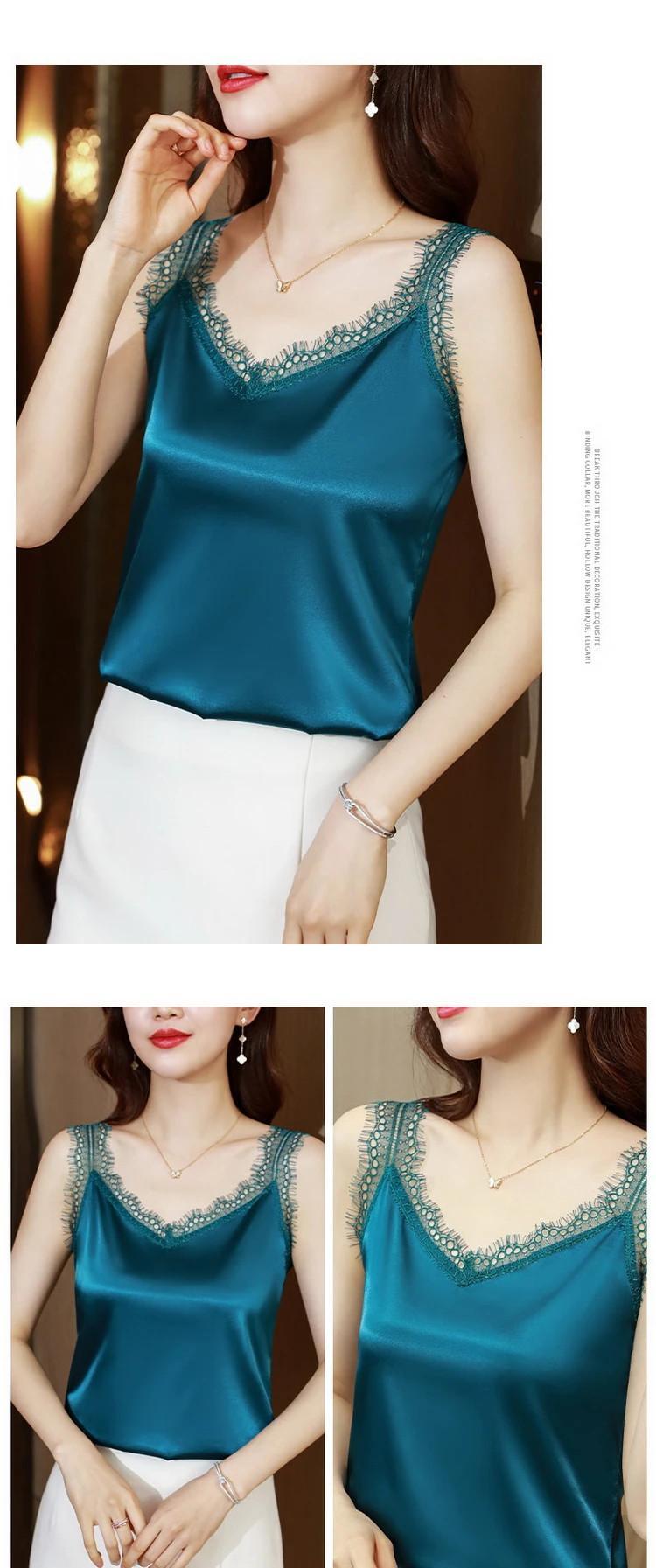 送料無料 夏サテン V ネックシャツセクシーなレーストップ女性ユースブラウス固体ルーズノースリーブシルク 25218 サマー 夏物 Vネック ソリッドカラー AE665656680086652792