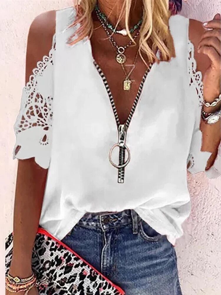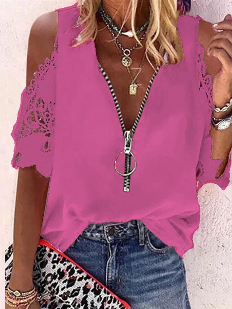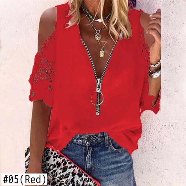送料無料 夏レース中空アウト V ネックジッパーブラウス半袖シャツ女性ルーズセクシーなトップス 24989 ショート ハーフスリーブ サマー 夏物 Vネック AE665656659478928724