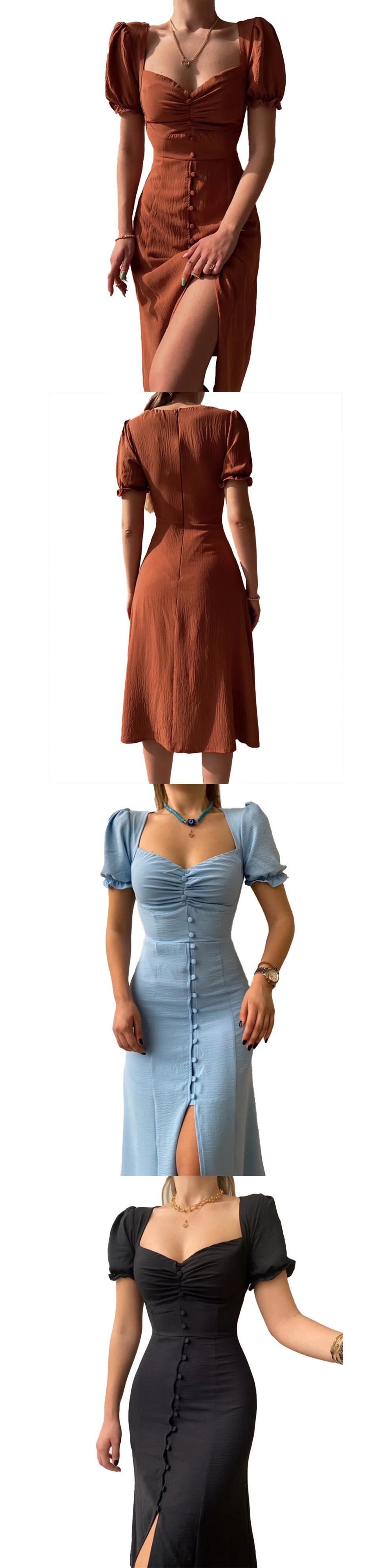 送料無料 セクシーなパフスリーブロングドレススクエアカラー女性ドレススリムシングルブレスト女性オフィスレディ固体 A リネン 25821 Aライン ソリッドカラー スクウェア 会社 学校 通勤や通学にも AE665656655347188720