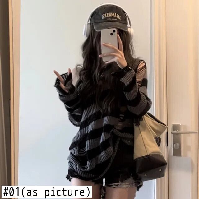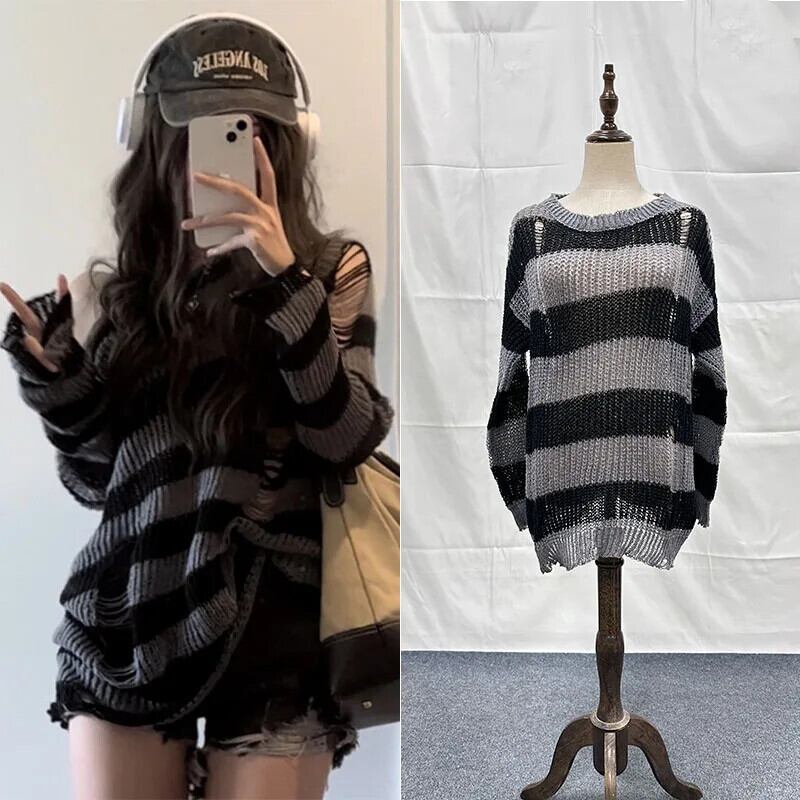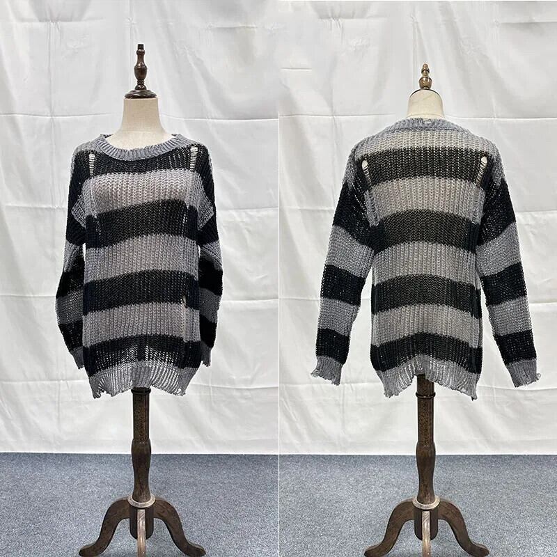 送料無料 ストリートプルオーバーセーターストライプニット長袖女性秋パンク中空アウトホールルーズオールマッチトップ 29236 ロング オータム 秋物 AE665656620363572460