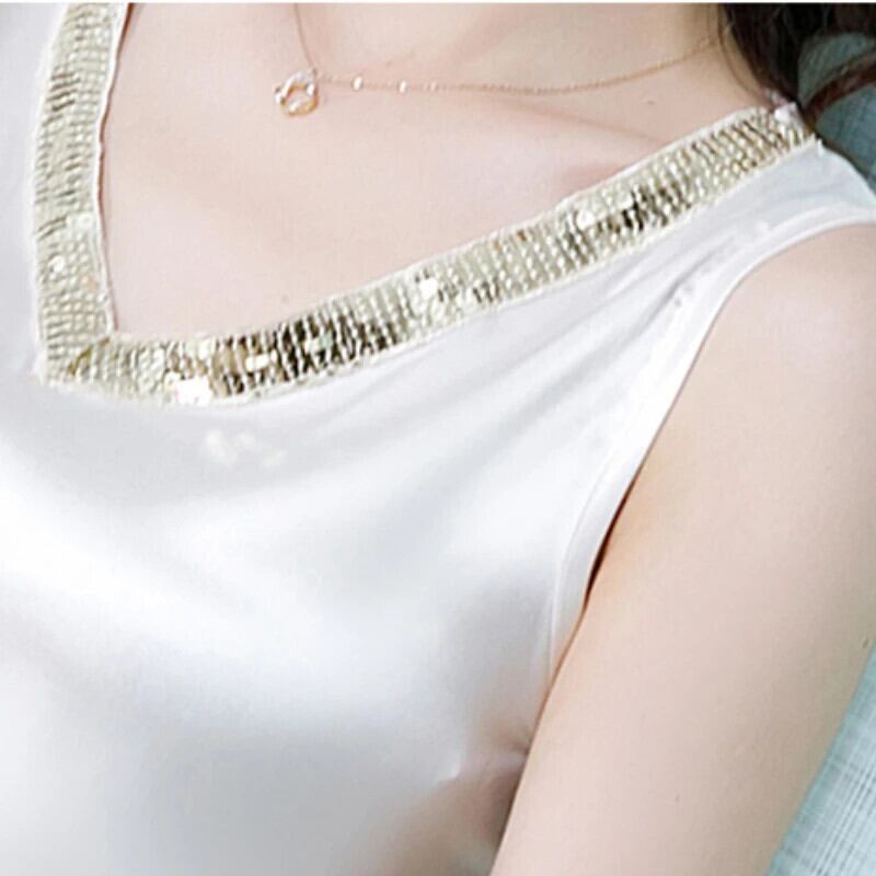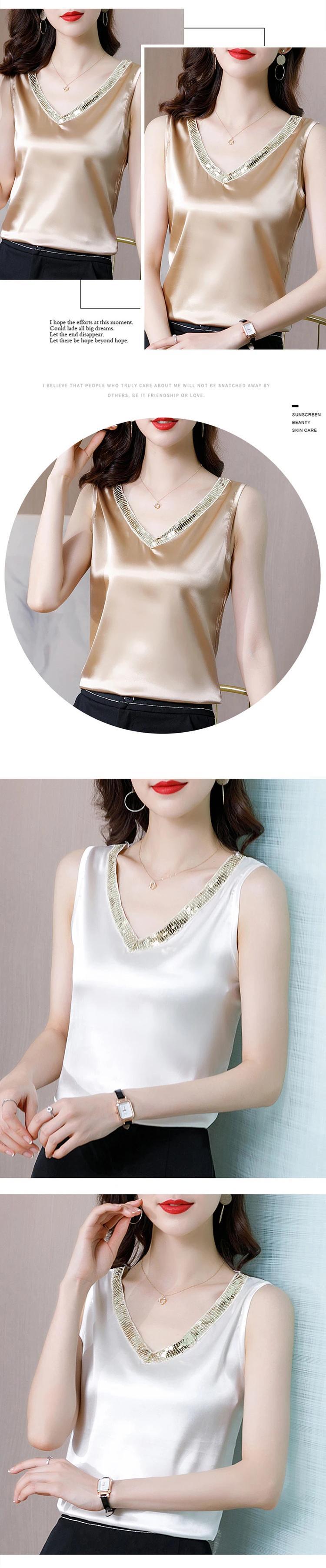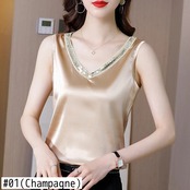 送料無料 青少年スパンコールシャツ夏の女性ノースリーブサテンブラウス 2023 V ネックルーズシルクトップ 25513 サマー 夏物 Vネック AE66565668640441807