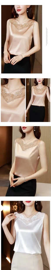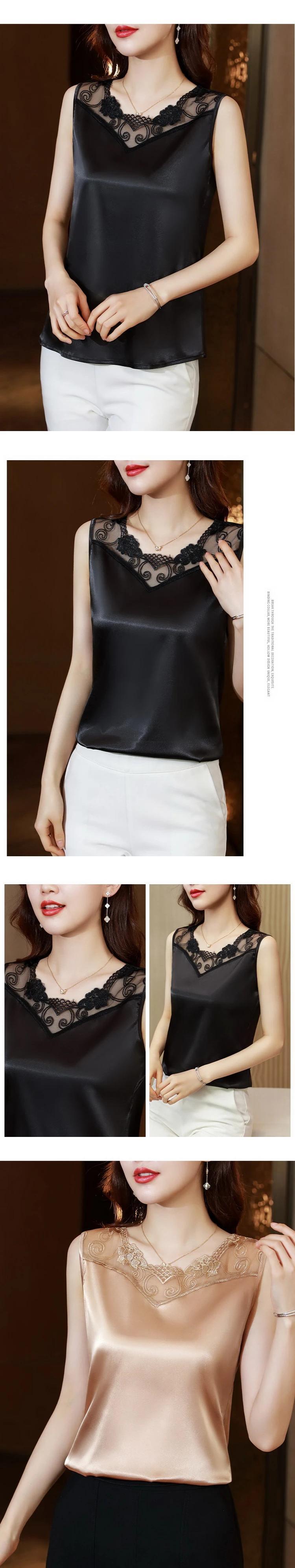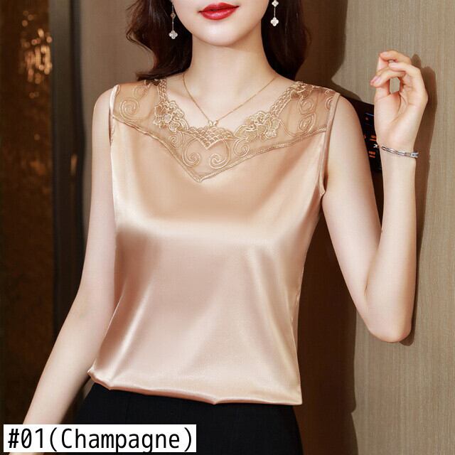 送料無料 夏ノースリーブルーズシルクシャツレース刺繍ネックサテンブラウス女性オフィスレディトップ 25219 サマー 夏物 会社 学校 通勤や通学にも AE665656655293076080