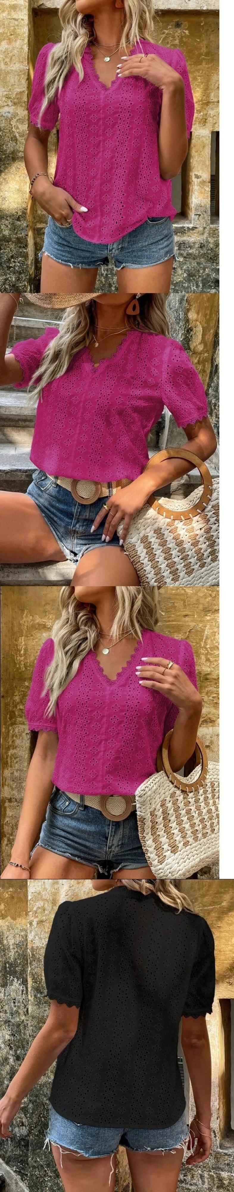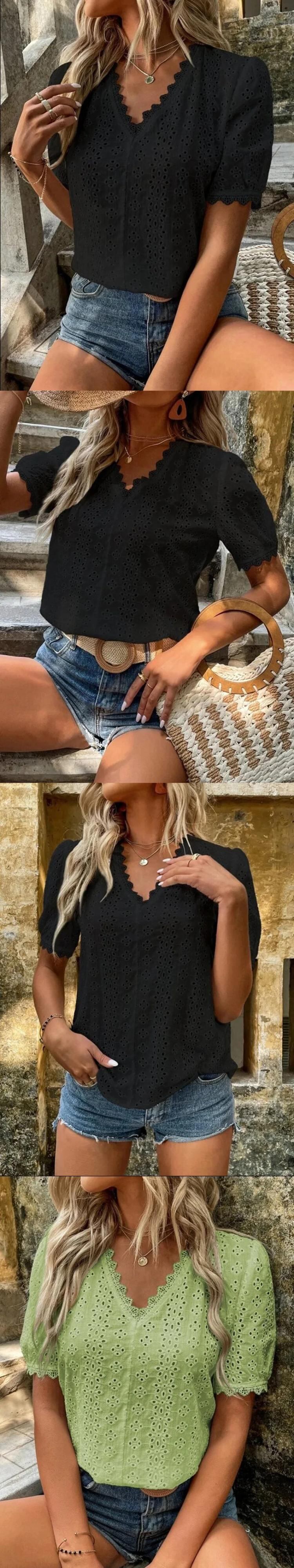 送料無料 2023 夏の女性の V ネックオフィスレディパフ半袖トップスヴィンテージ中空アウトレースシャツ綿ブラウス 21385 ショート コットン ハーフスリーブ サマー 夏物 Vネック ビンテージ 会社 学校 通勤や通学にも AE665656624192142946