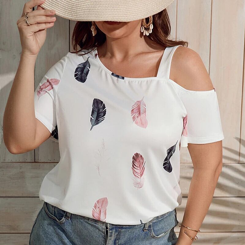 送料無料 2023 中空アウトオフショルダースリムシャツプリント半袖ルーズシャツ女性の夏のスキューカラーブラウス 28062 ショート ハーフスリーブ サマー 夏物 AE665656637716375224